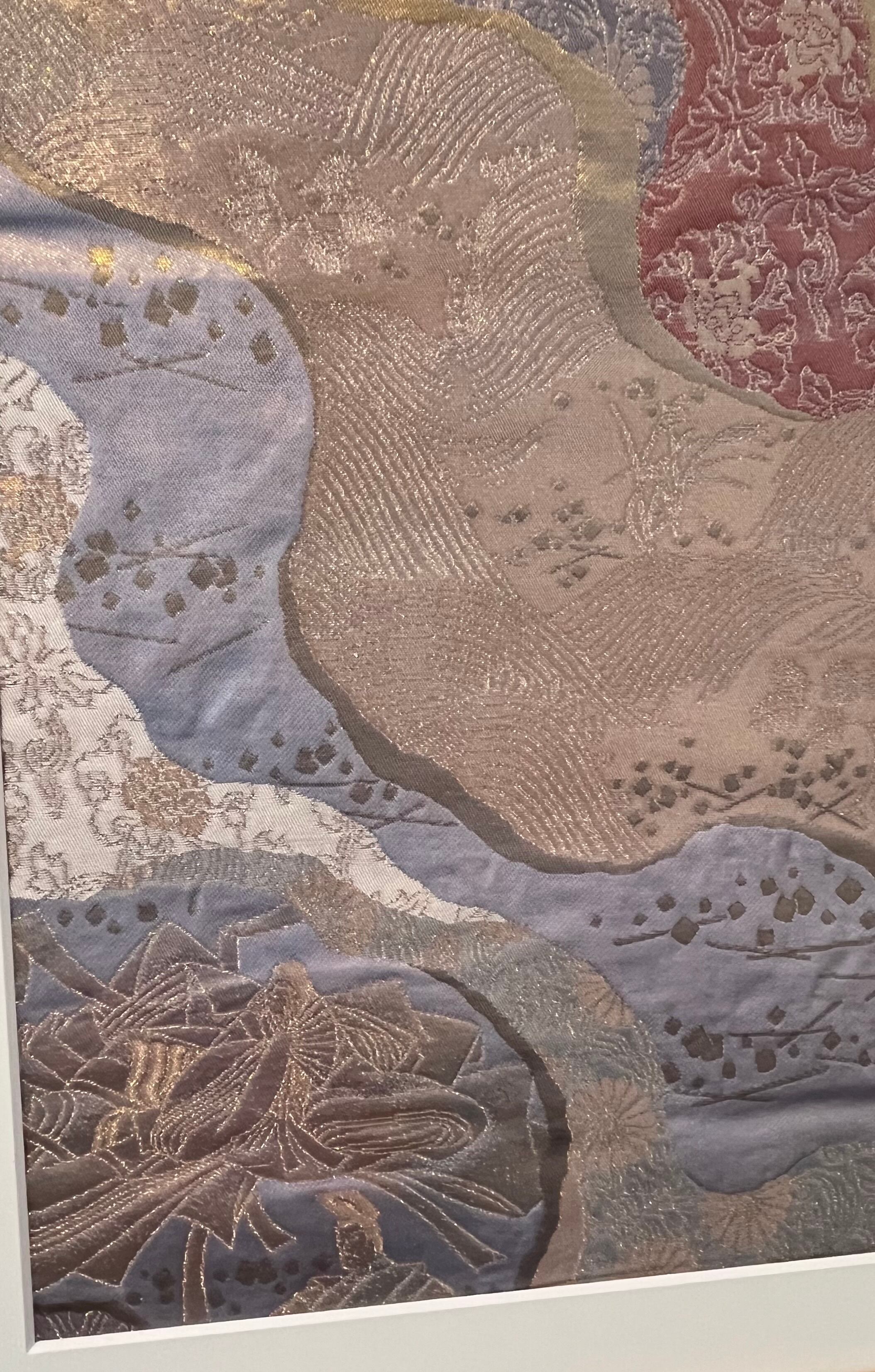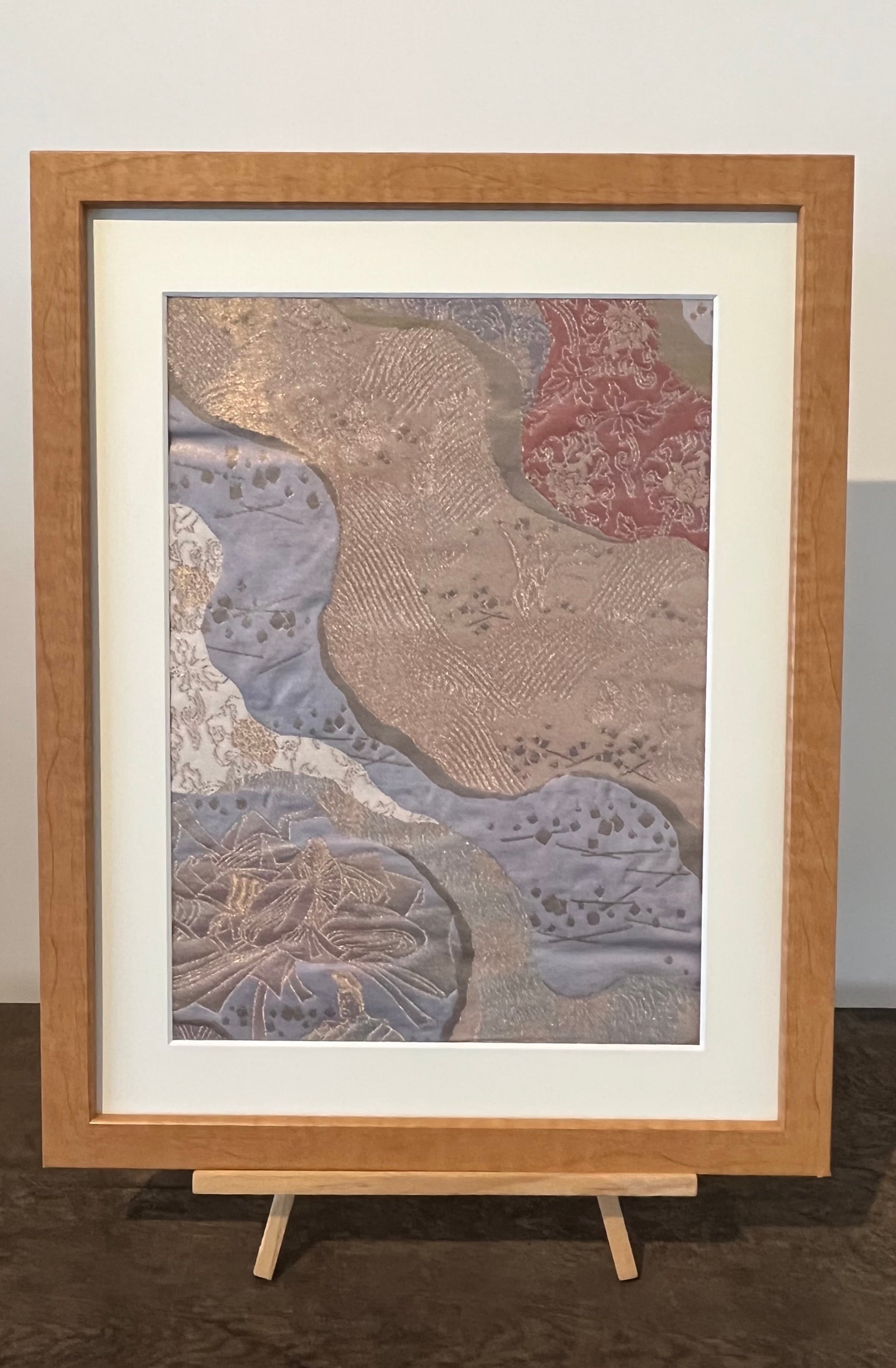 This artwork is framed from a Nishijin-ori fukuro-obi, estimated to have been woven in Kyoto during the 1980s–1990s.
