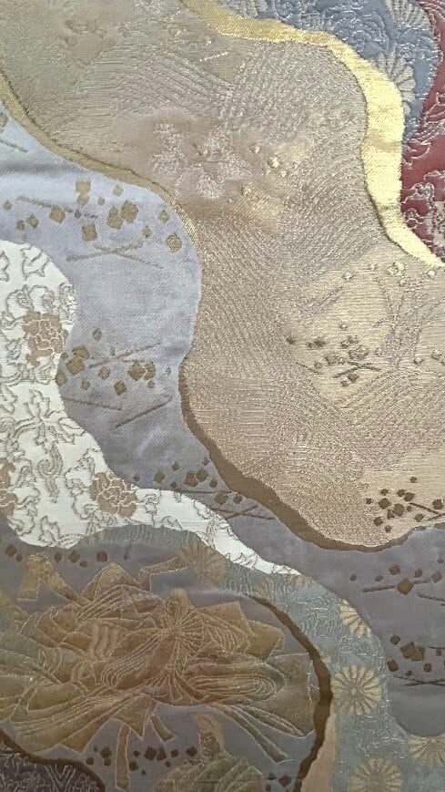 金・銀・淡色の糸を巧みに織り合わせ、曲線で区切られたエリアごとに異なる織技法や地紋が施されています。花唐草、流水、抽象的な波文など、古典的な吉祥文様が組み込まれ、花唐草は「繁栄」「子孫繁栄」、流水文は「清らかさ」「繁栄の継続」を象徴し、全体として「山水図」や「四季の移ろい」を思わせる構成となっています。