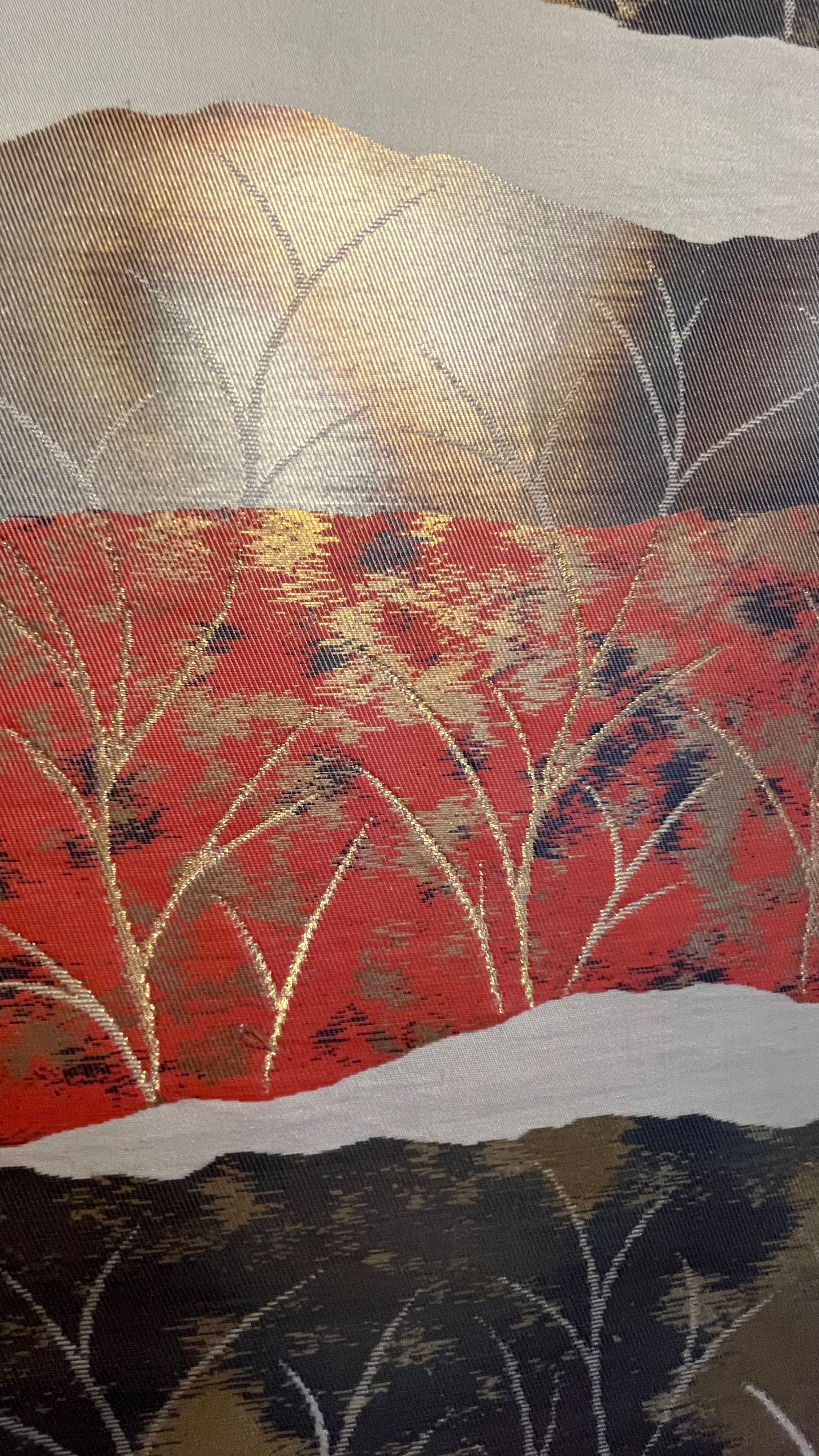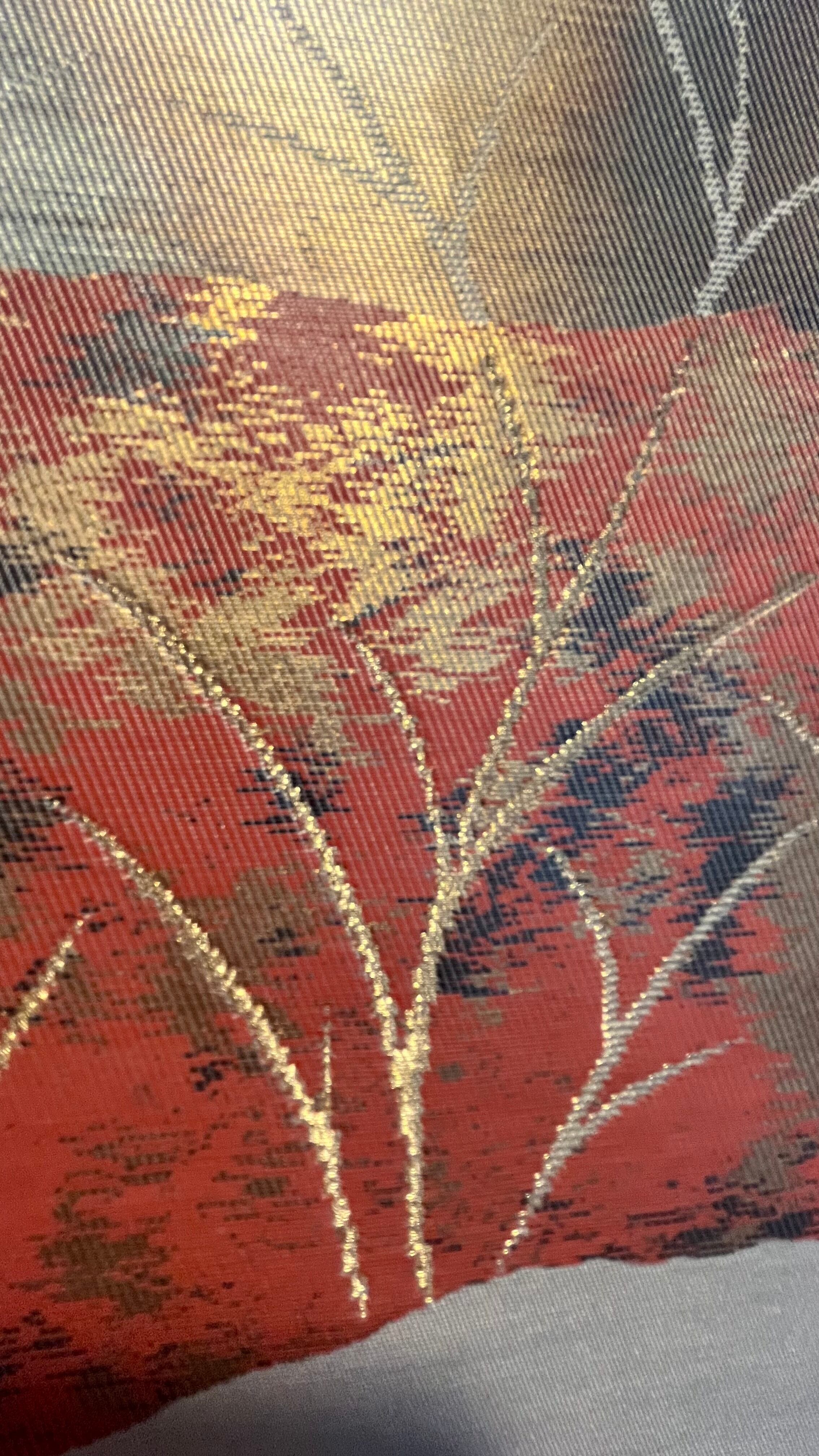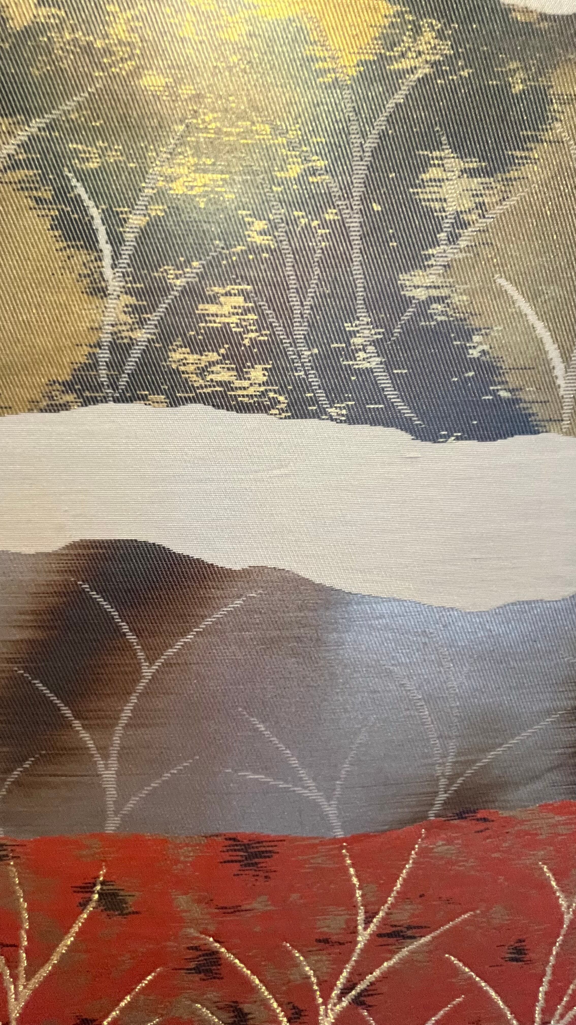 1980〜1990年代頃の西陣織と推定されます。西陣織の錦織(にしきおり)技法を用い、金糸・銀糸・色糸を緻密に織り重ね、柔らかな光沢と立体感を生み出しています。 モチーフは、ゆるやかな曲線で区切られた山並みと、枝葉が伸びる木立の模様。山肌には金箔糸の輝きが差し込み、季節や時間の移ろいを映すかのようです。立体的な本金箔糸の織り込みとは異なり、この帯では繊細で均一な光沢感が全体に広がり、落ち着きと品格を兼ね備えた仕上がりとなっています。宵の空のような落ち着きと、雅やかな輝きを湛えます。
