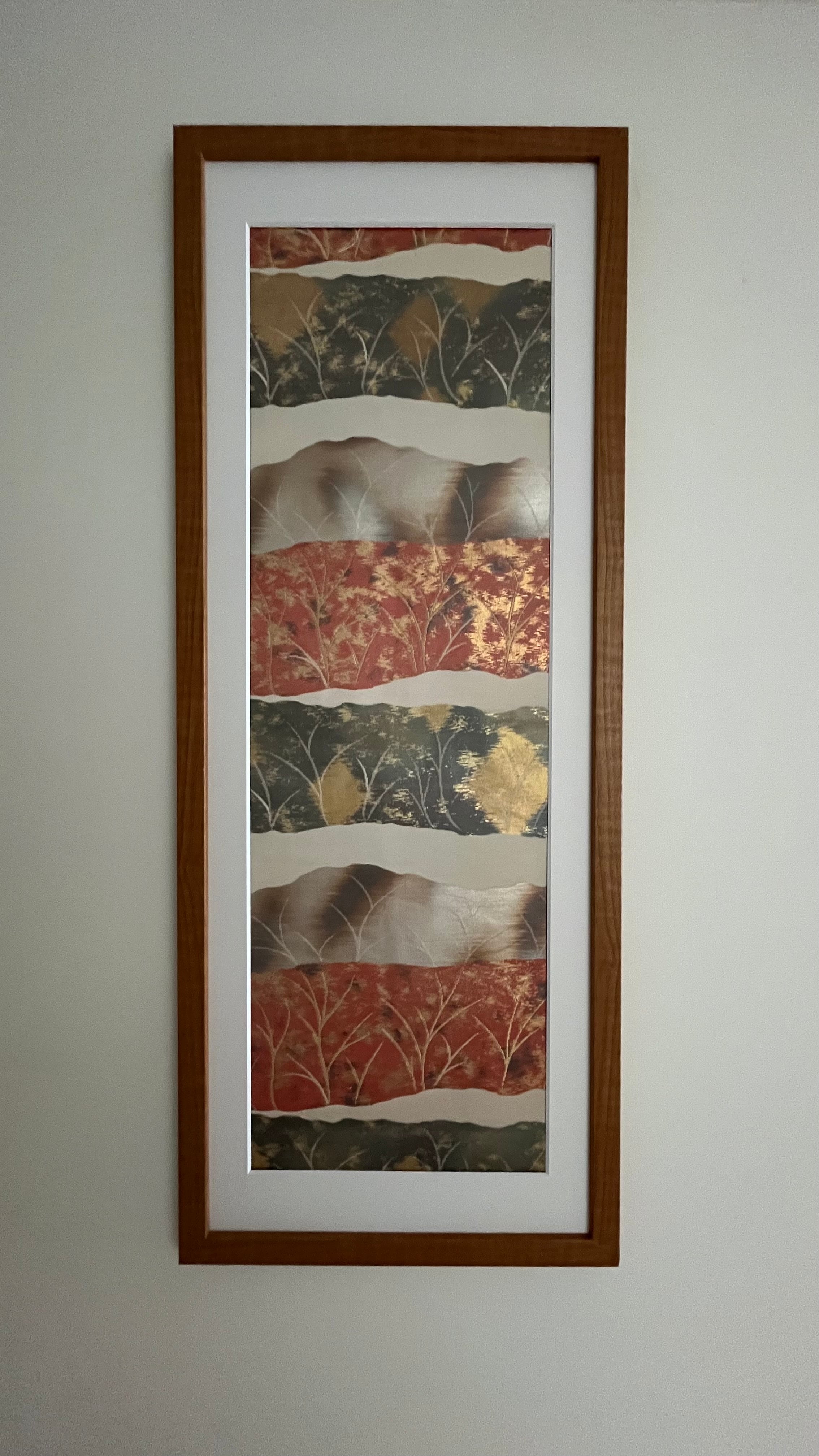 The motif depicts gentle mountain ranges divided by flowing curves, and groves of trees with branches reaching upward. The golden threads shimmer across the mountain surfaces, as if reflecting the passing of seasons and the flow of time.