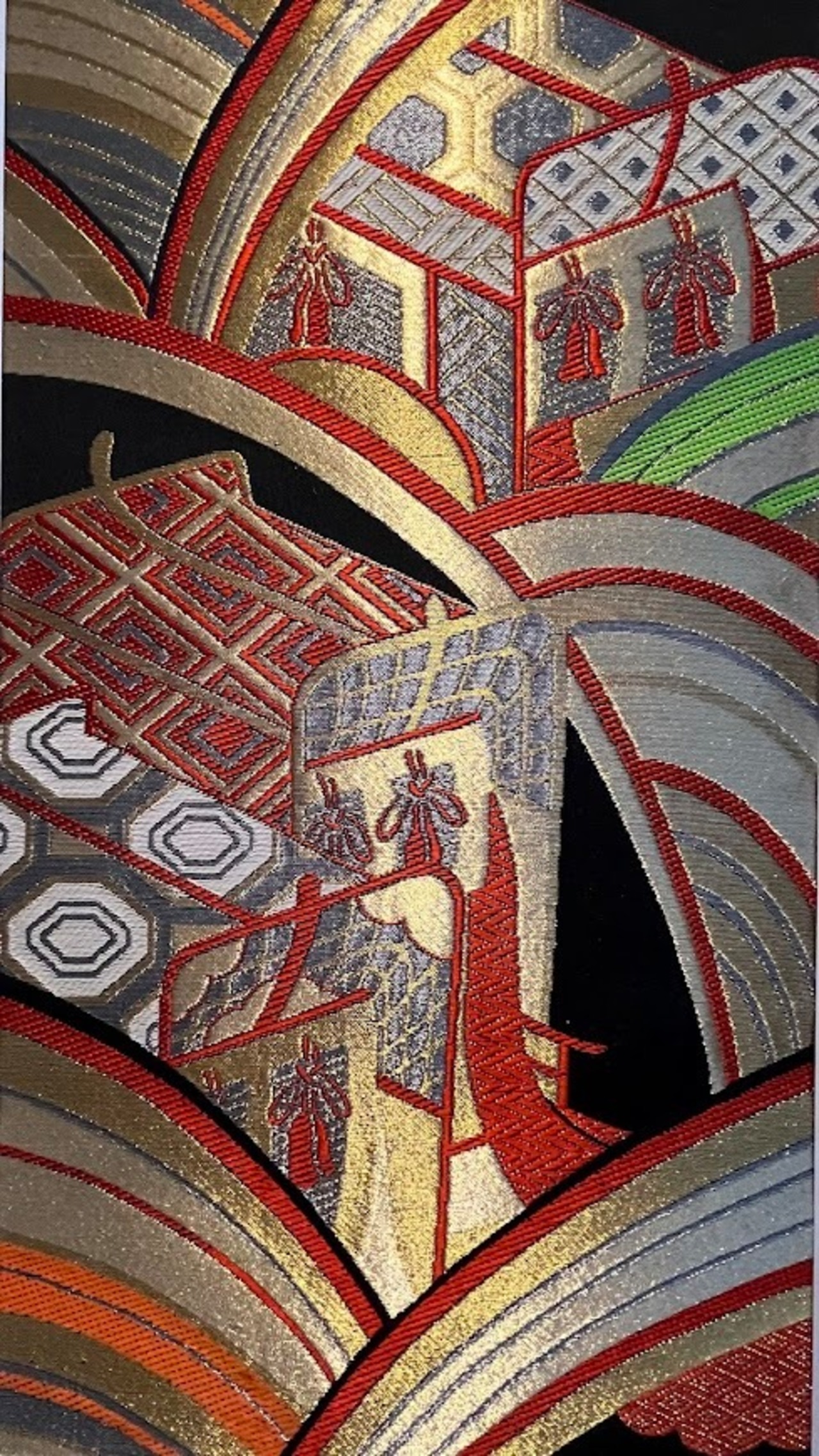 モチーフは、宮中の高貴さを象徴する御所車(ごしょぐるま)と、古典文様である檜垣(ひがき)文様をアレンジした幾何学柄。檜垣文様は檜の板を斜めに組んだ垣根に由来し、長寿や家運隆盛を願う吉祥柄として古くから用いられています。本作では、その檜垣を装飾的に変形させ、御所車や流麗な曲線と組み合わせることで、重厚感と動きのある構図に仕上げられています。