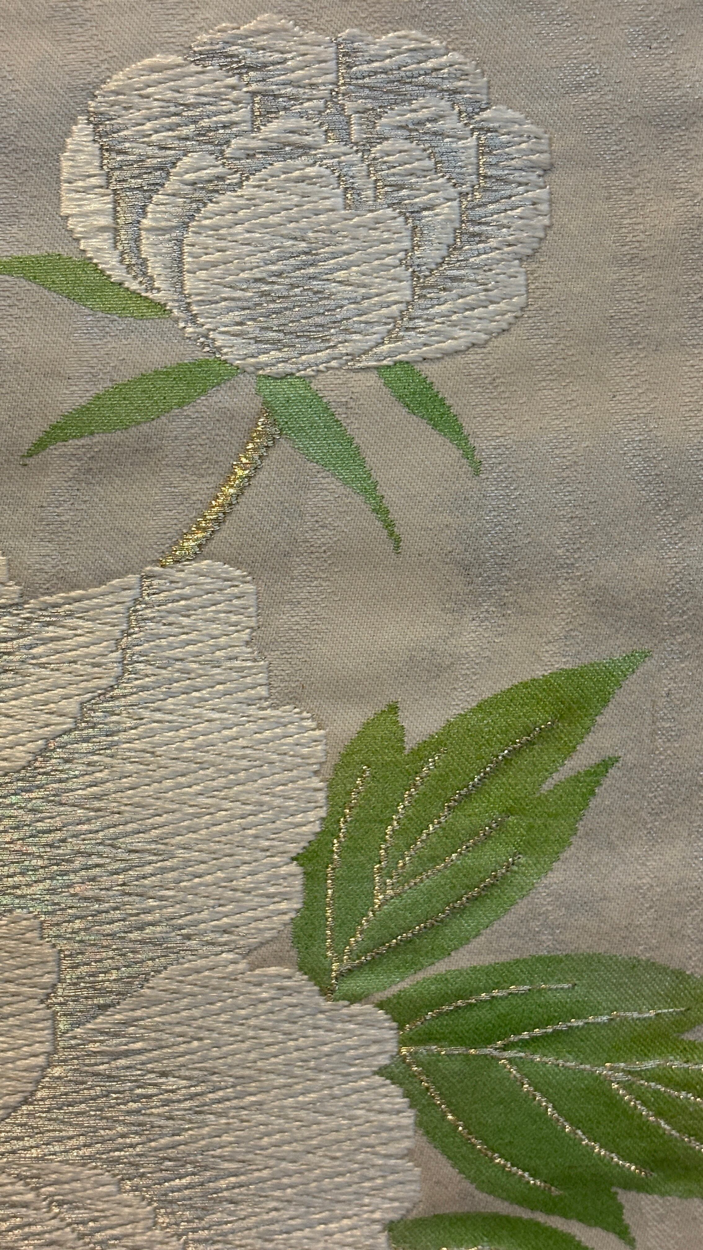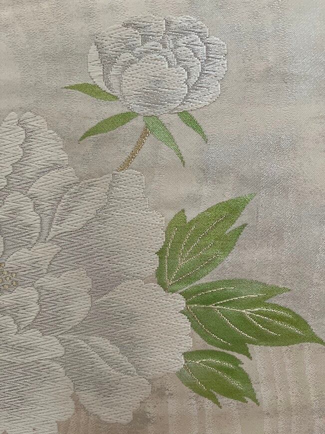 白一色の牡丹は帯の中でも数が少なく、糸の質感や陰影で花の立体感を表現するためには高度な織技術が求められます。