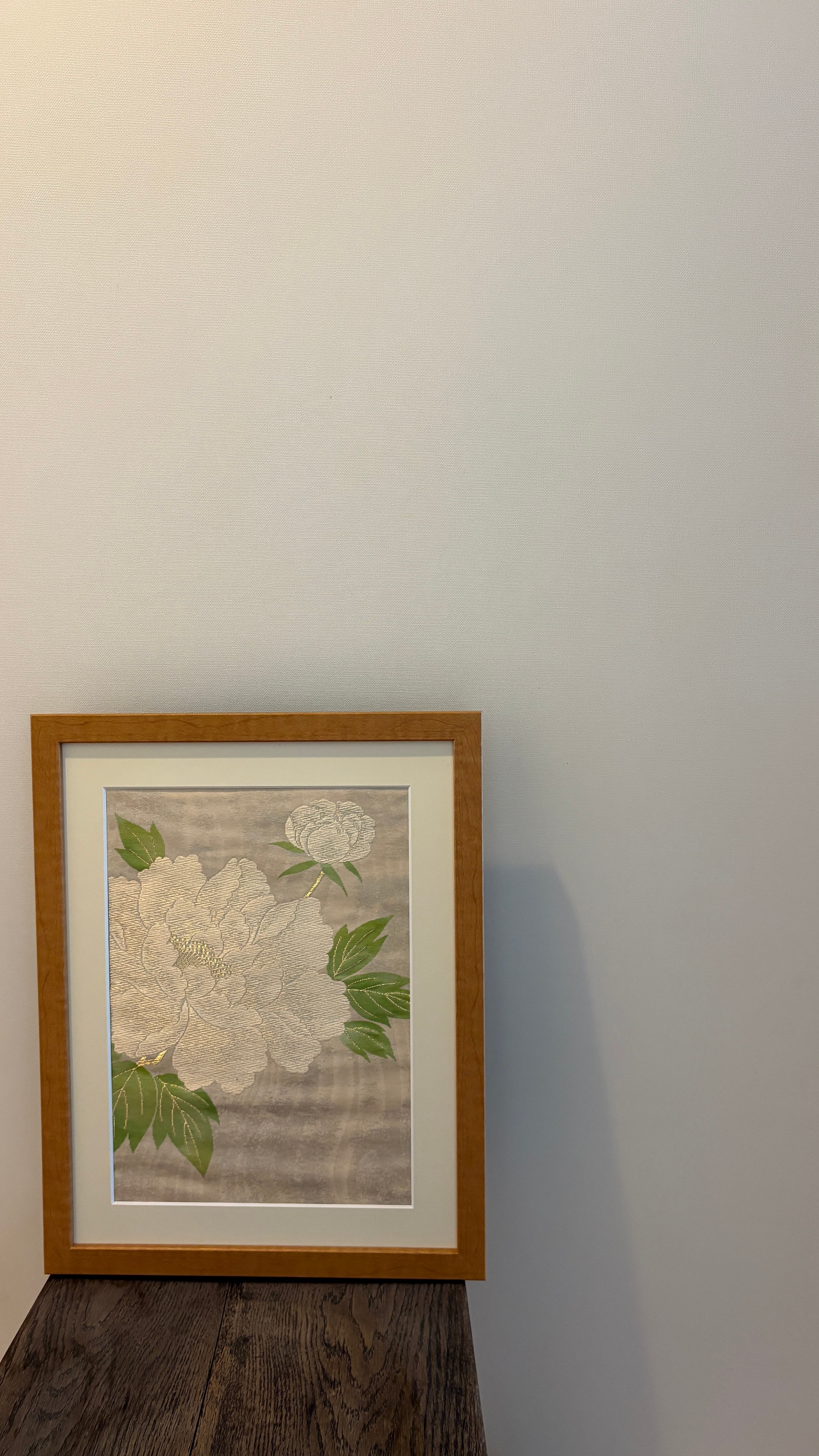 Pure white peonies are rare in obi textiles, and achieving their dimensionality through weaving requires exceptional skill and craftsmanship.