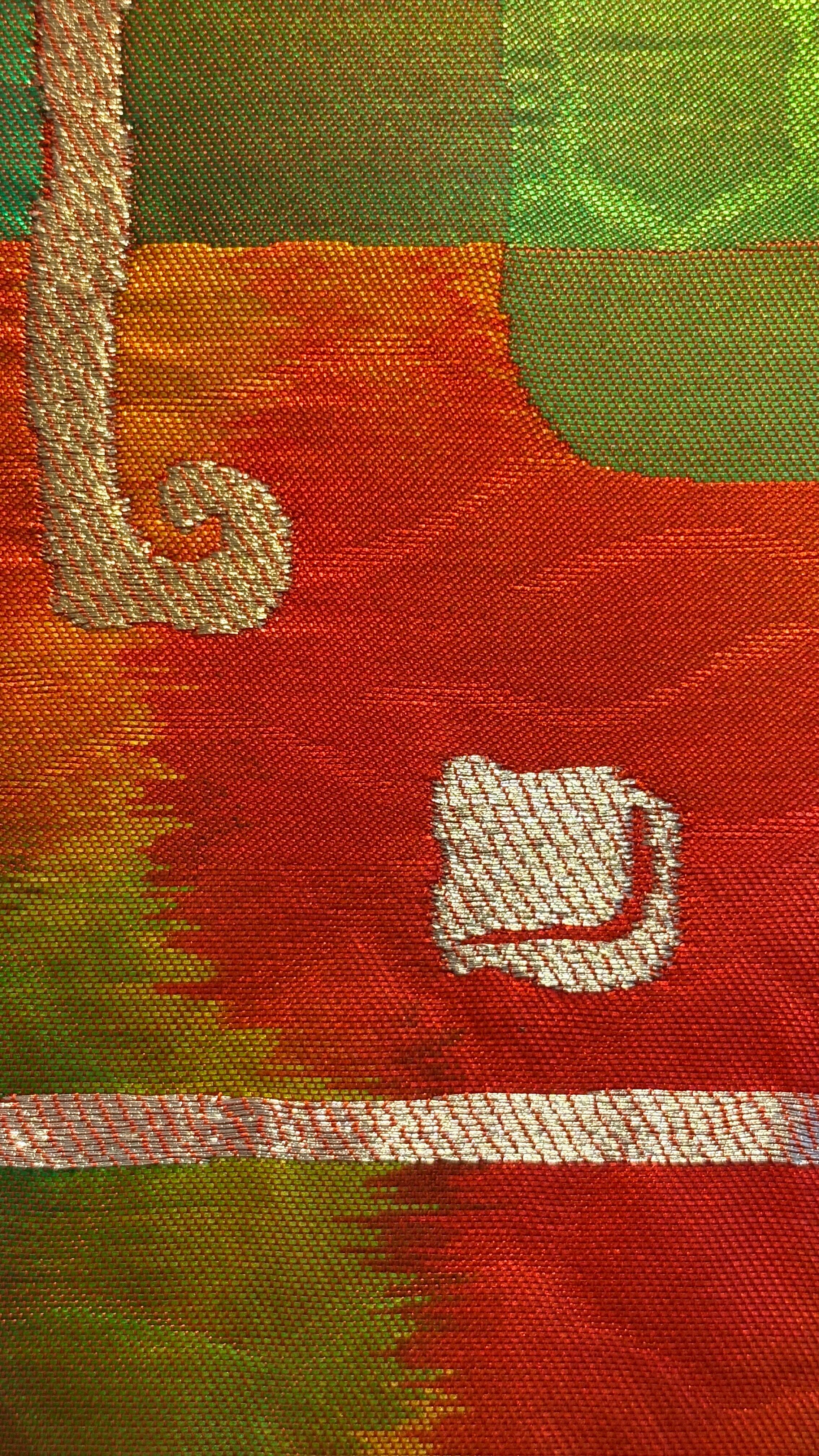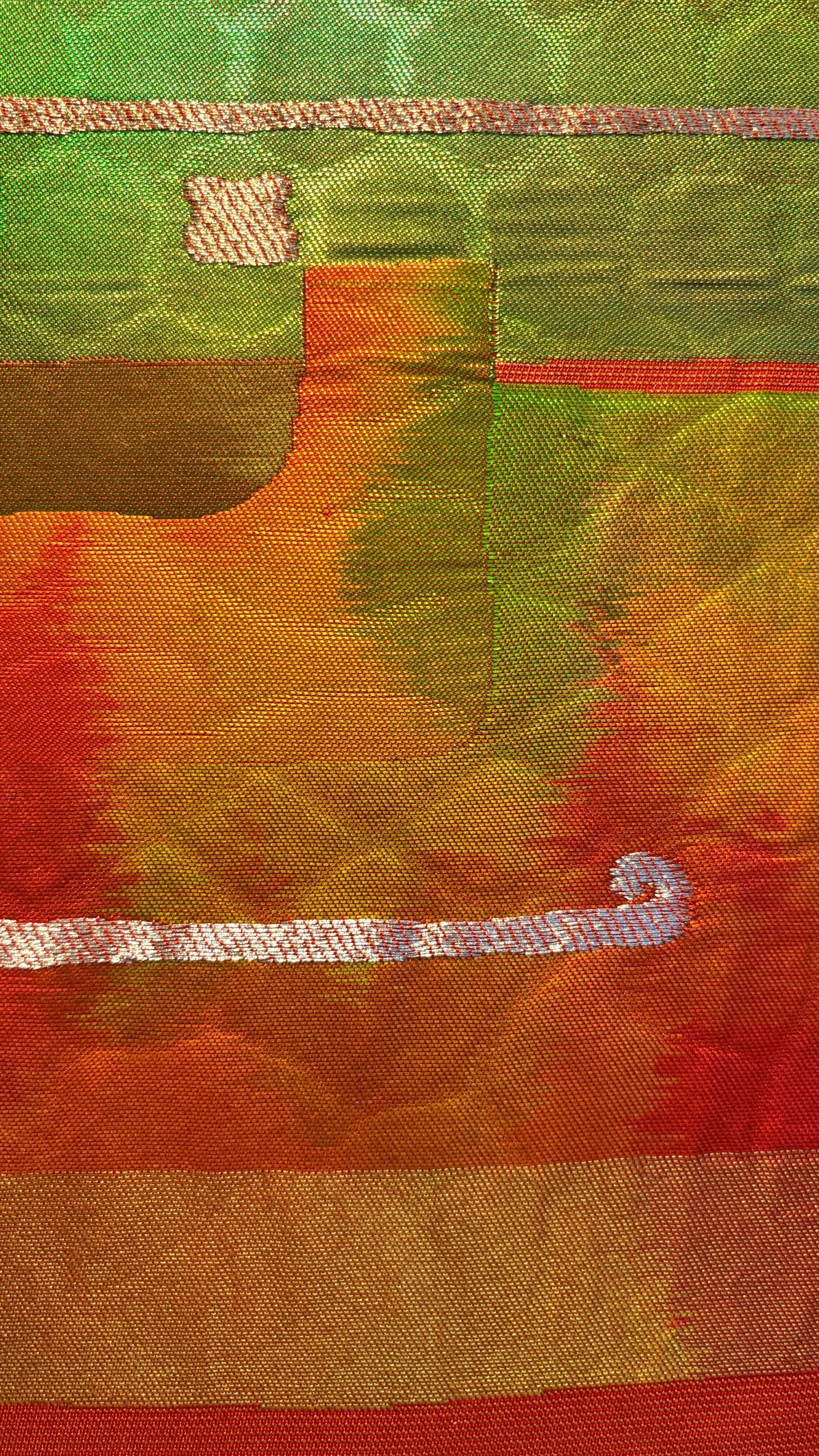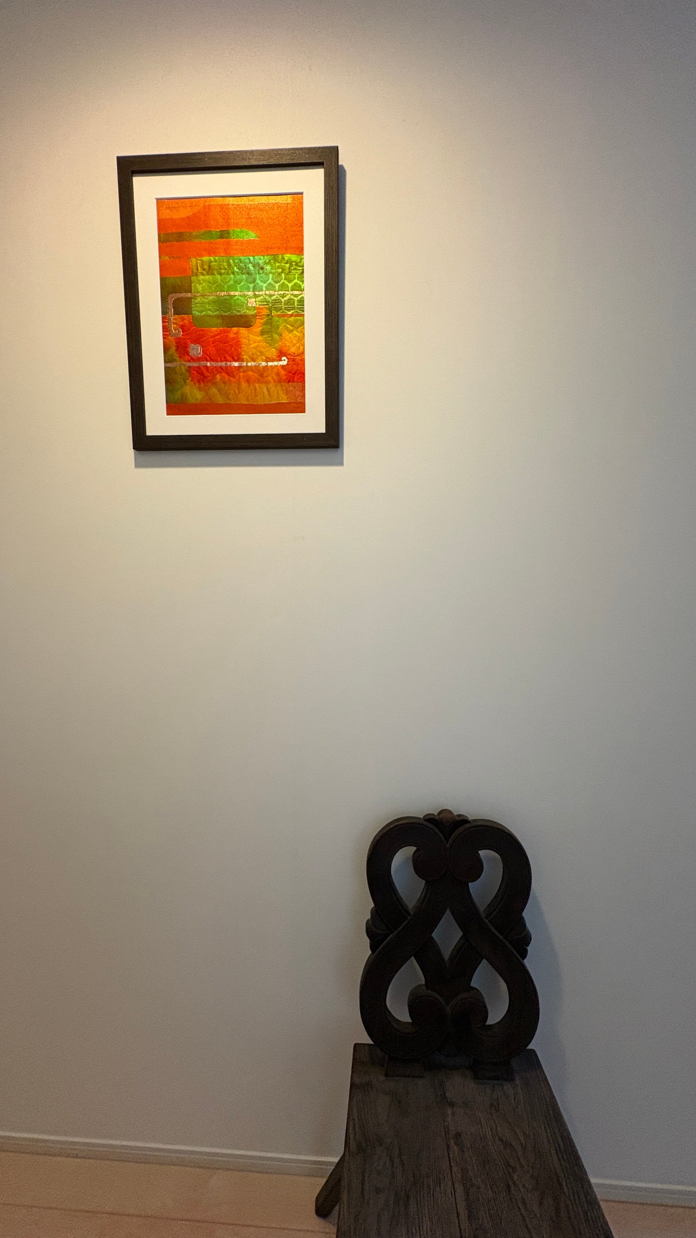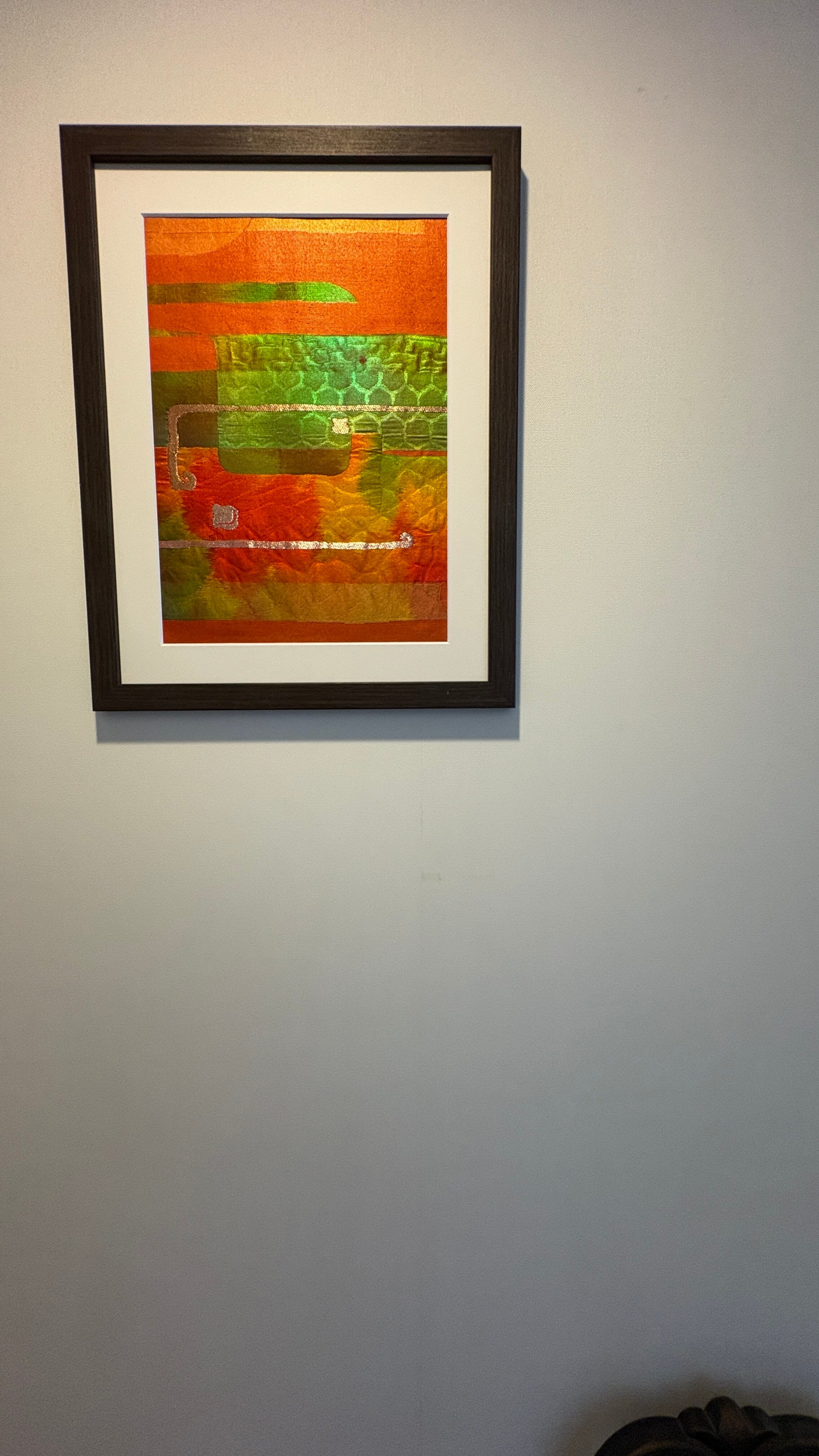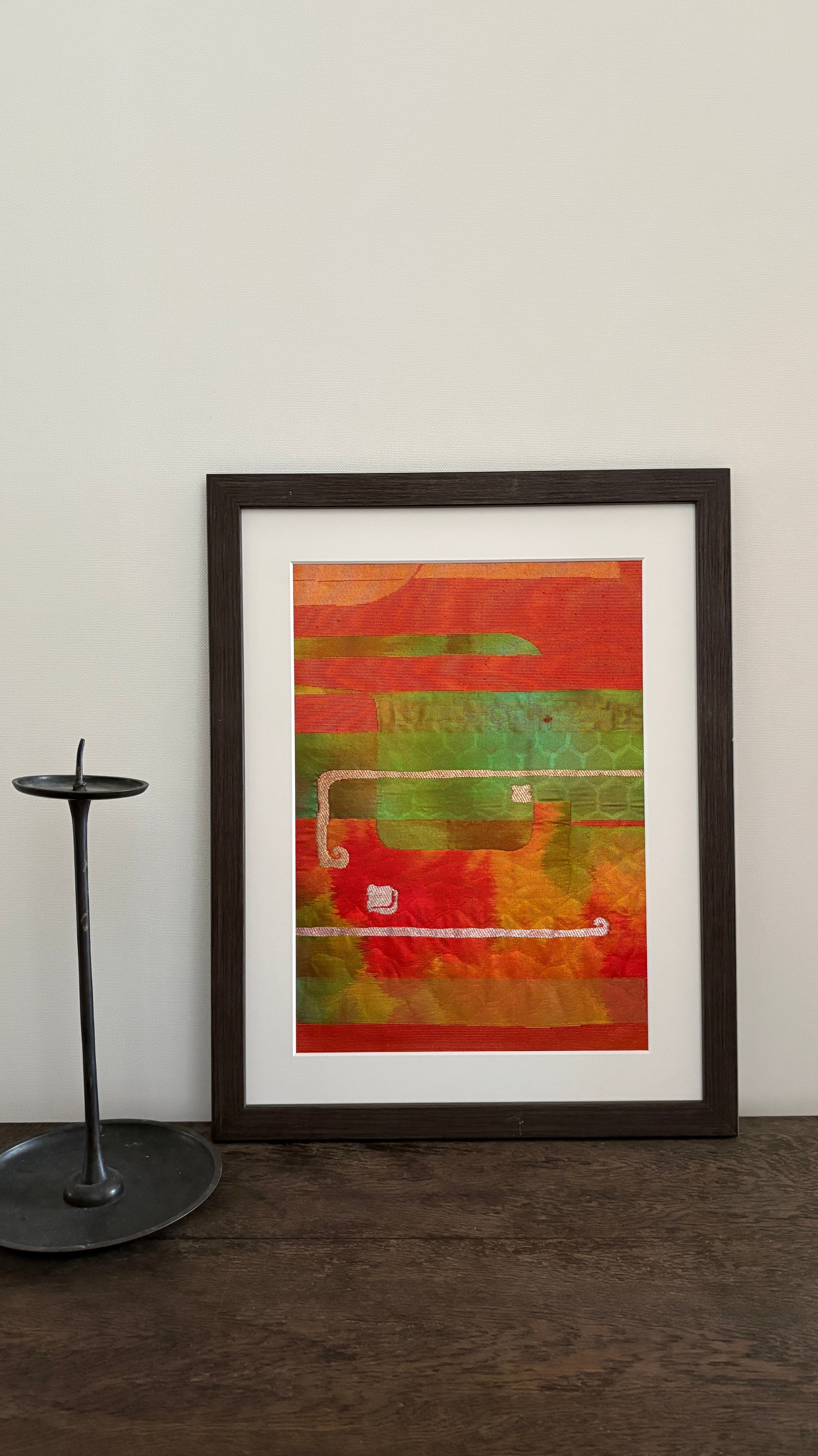 1980〜90年代頃の西陣織と推定される袋帯を額装したアート作品。 鮮烈な赤・橙・緑のグラデーションに、銀糸の直線と曲線が重なり合い、まるで音楽の旋律が 奏でるような豊かな表情を見せています。 情熱や活力を象徴する赤と橙、調和や安らぎをもたらす緑、そして洗練を添える銀。 その色彩が織りなす調和は、空間に活力と上質な華やぎをもたらします。 光の角度や見る距離によって表情を変え、現代アートの絵画のように空間を彩る一枚です。