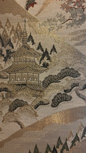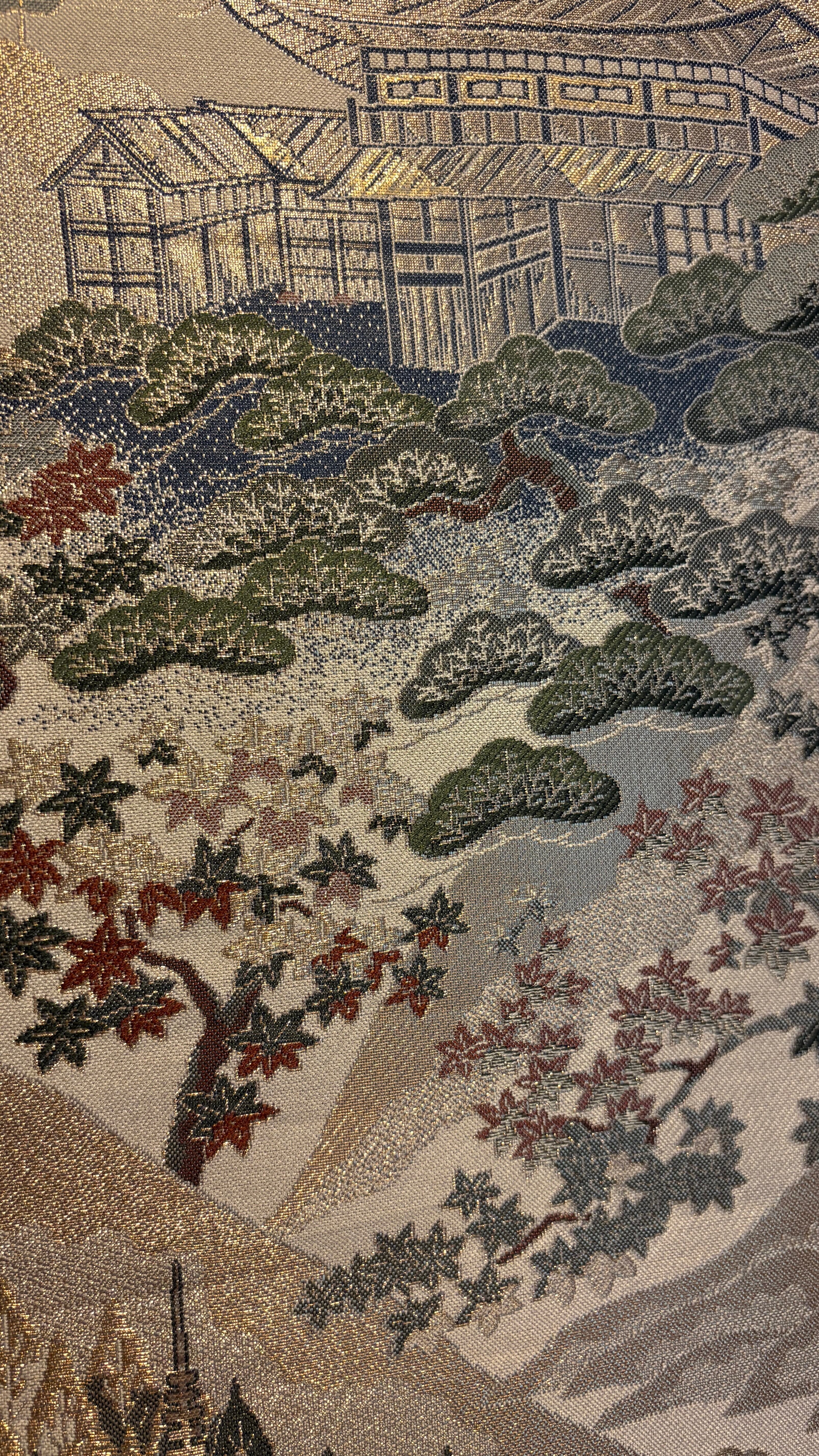 1980〜1990年代頃に制作された西陣織の袋帯と推定される作品を額装しました。山々に抱かれた京都の風景が描かれ、清水の舞台を思わせる建物や、三重塔・五重塔が点在する情景が織り込まれています。 松は不老長寿や不変の象徴、紅葉は秋の豊かさと美しさを表し、日本の四季と人生の移ろいを感じさせます。 金糸と銀糸を贅沢に用い、遠近感と光の変化を巧みに表現。光の角度によって朝霧の柔らかさや夕暮れの温もりが浮かび上がり、時の移ろいまでも感じられます。 まるで京都を旅するかのように、眺めるたびに新たな発見と感動を与えてくれる一枚。空間に格調と物語性を添えます。