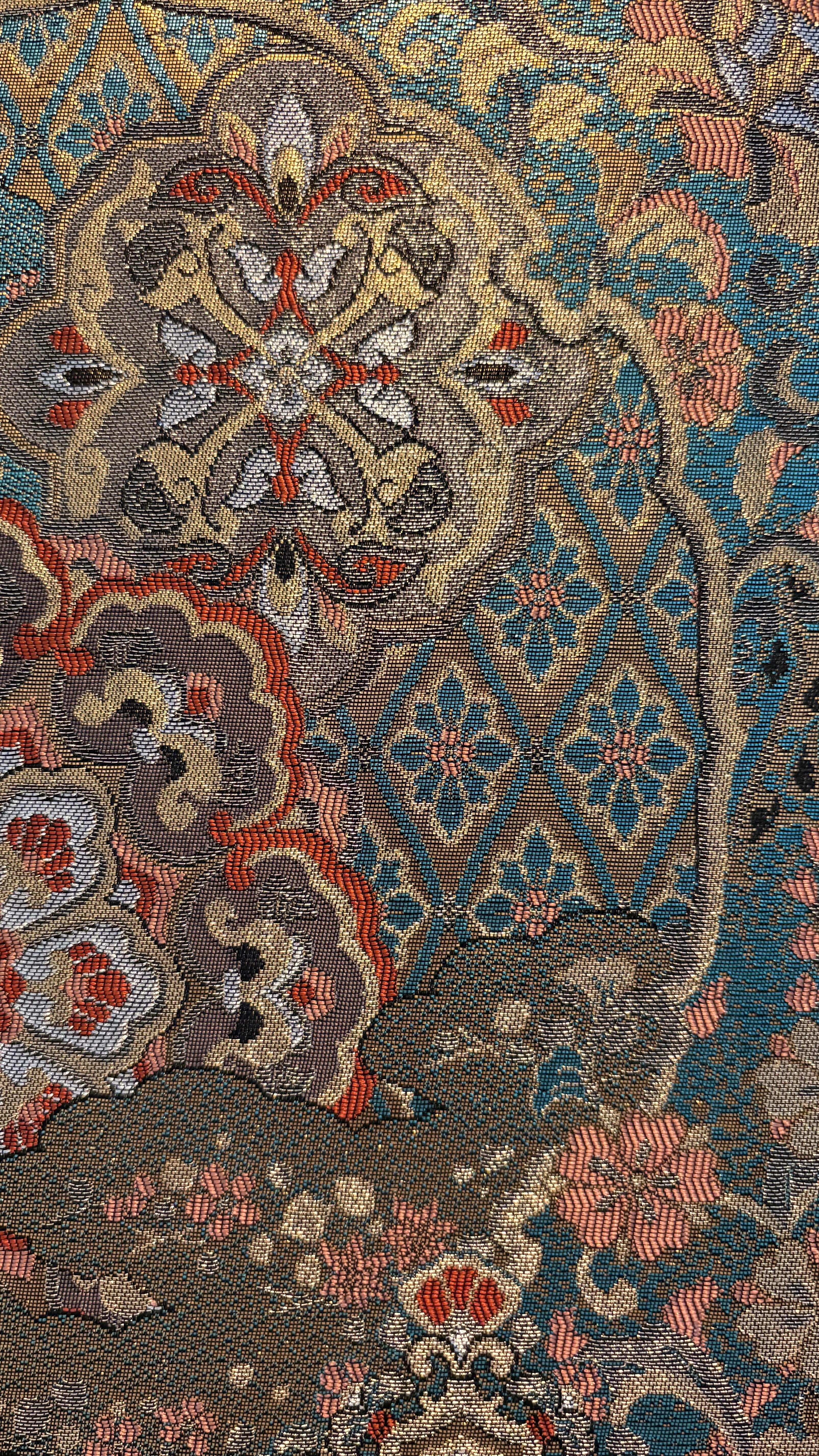 日本とアジア、西洋の装飾文化が重なり合うような豊かな表情のデザイン。重厚さと華やぎが共存する昭和の西陣織らしい色彩が魅力です。