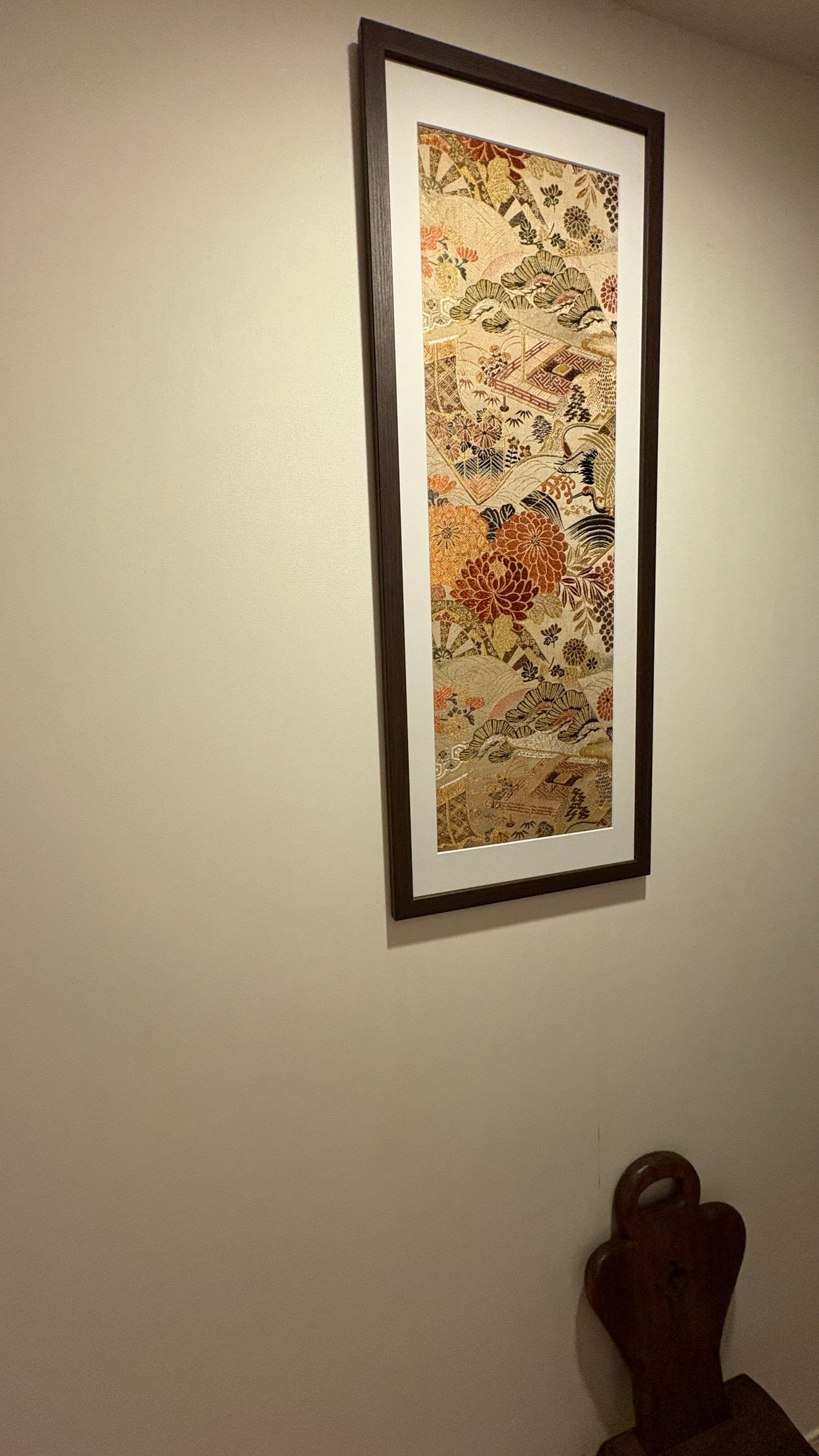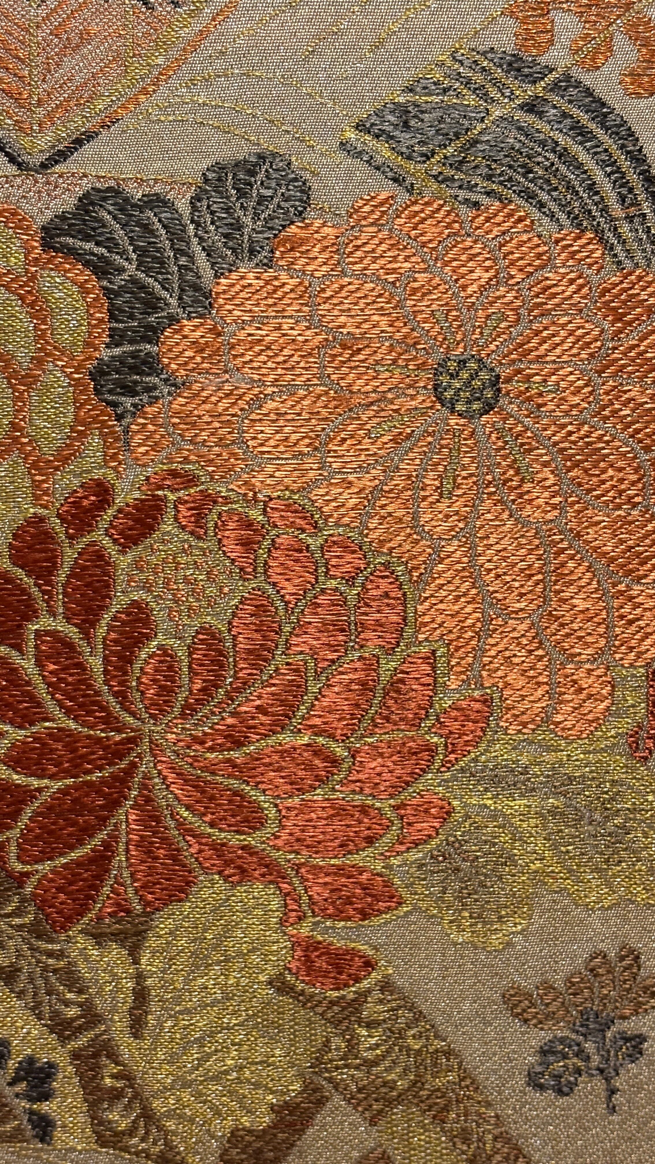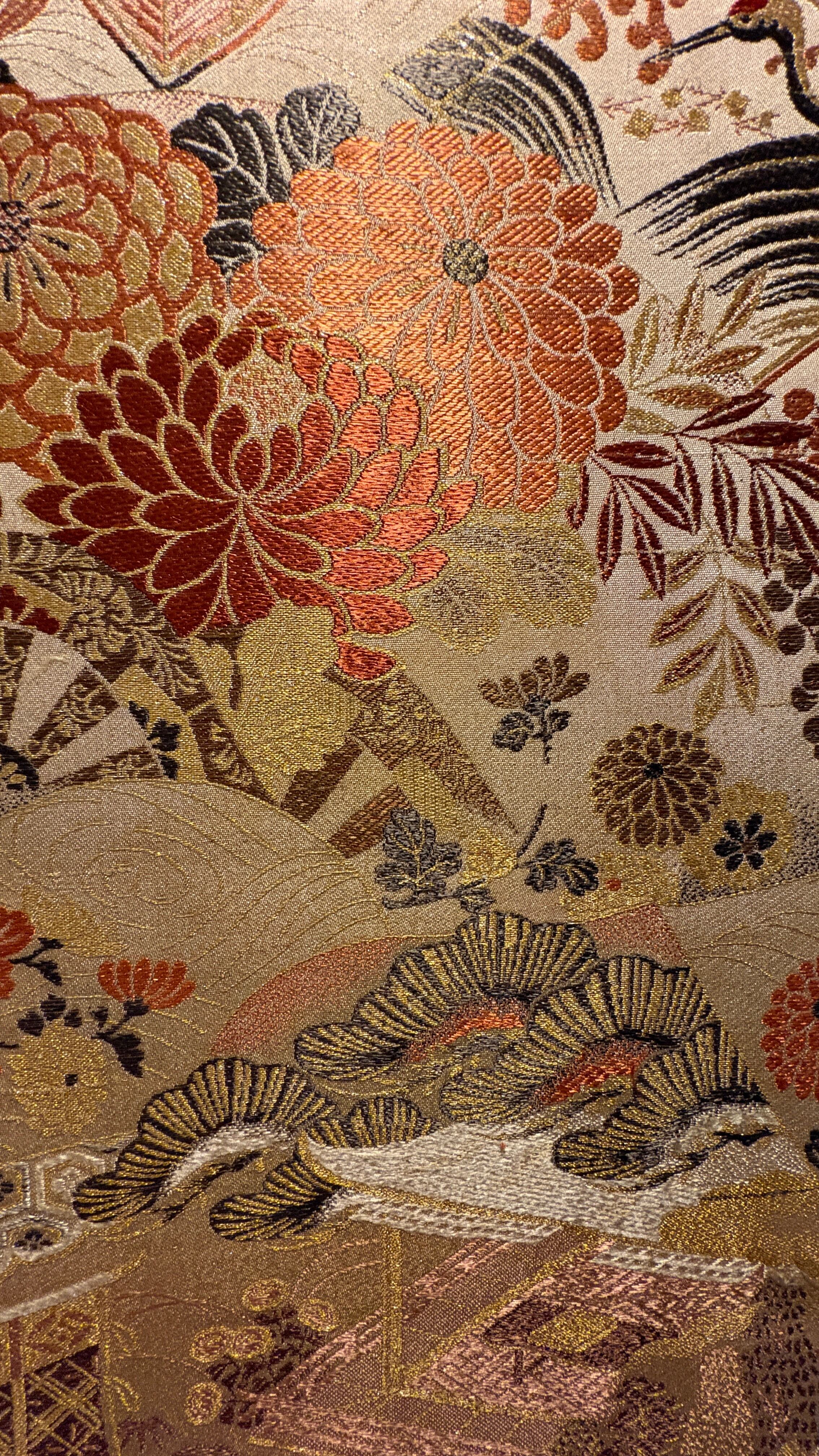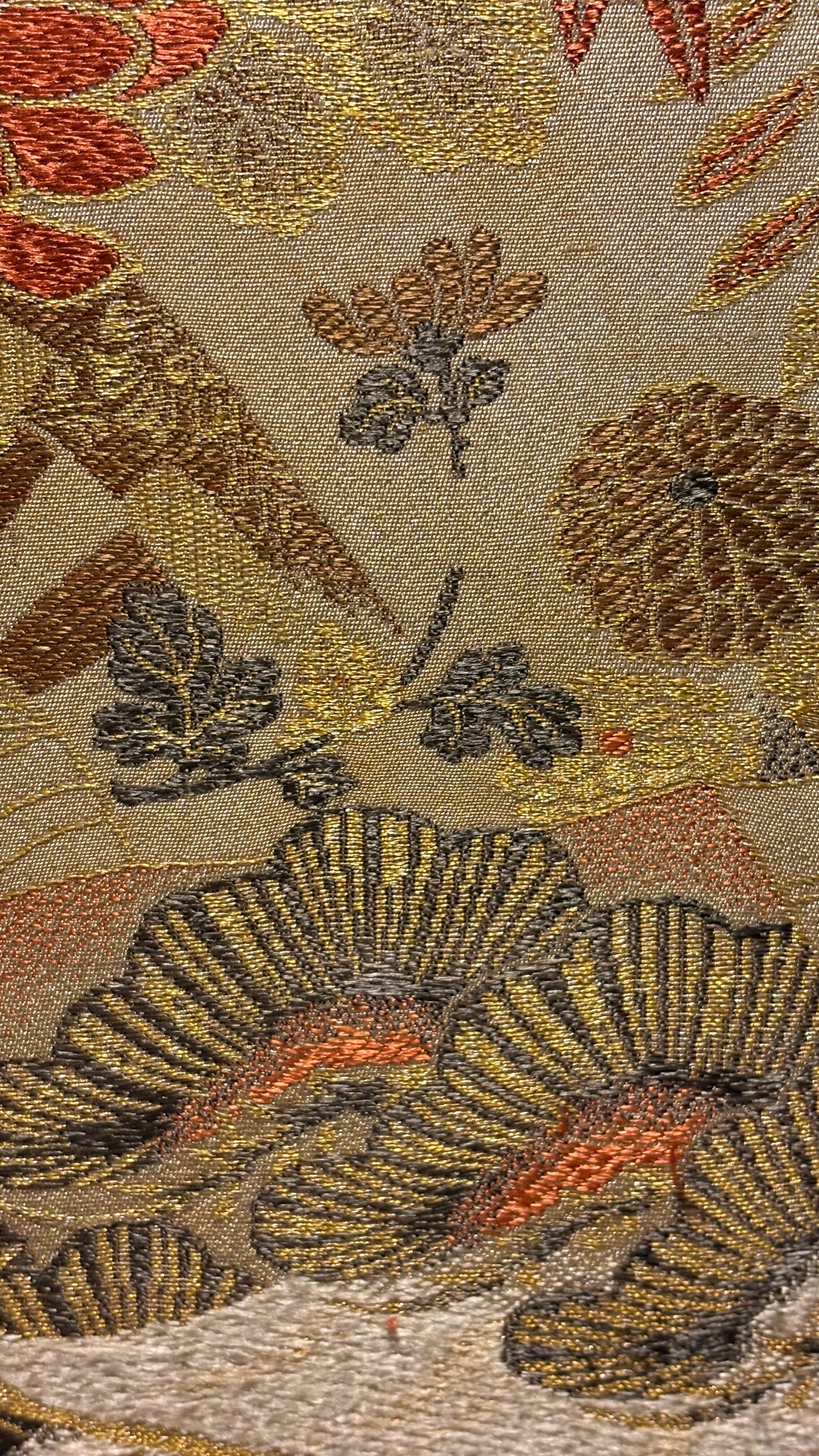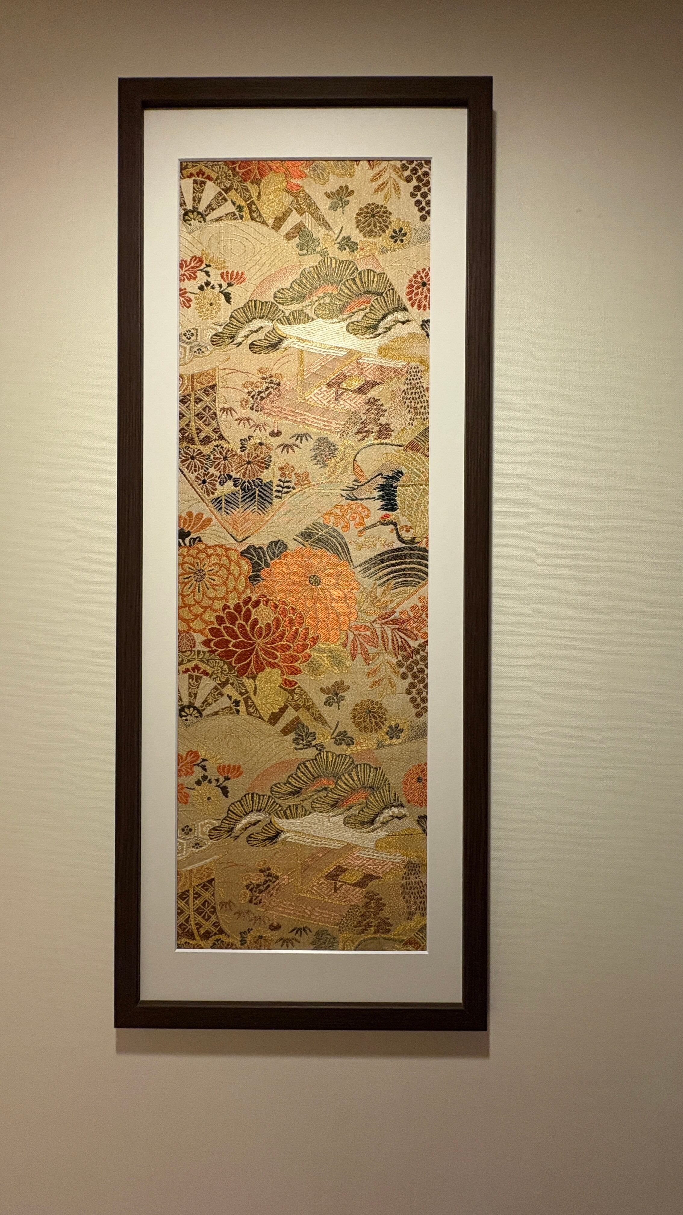 This artwork was created using a vintage obi woven in Nishijin, Kyoto, estimated to date from the 1980s–1990s. Nishijin weaving is renowned for its refined craftsmanship and rich decorative designs.