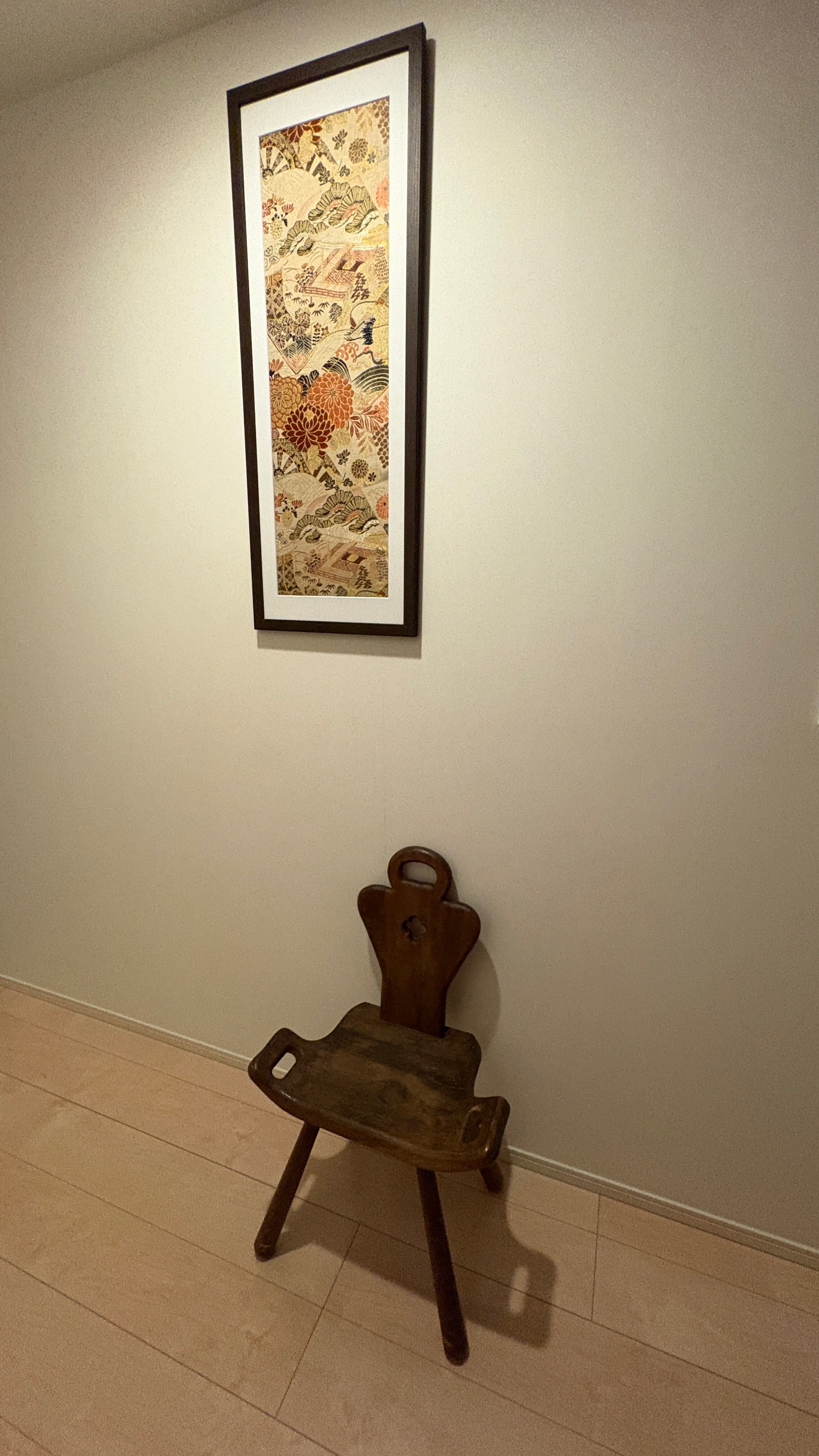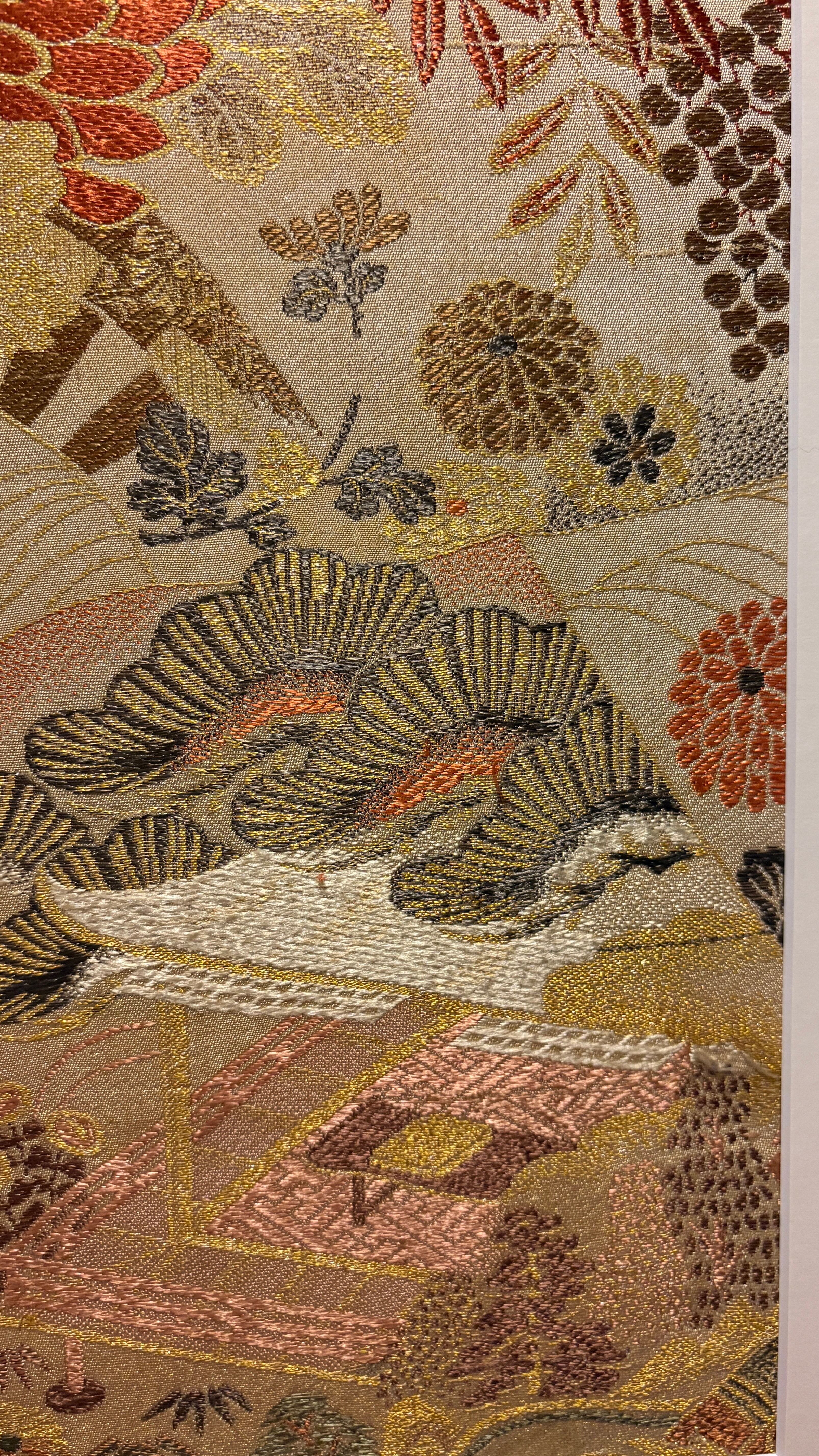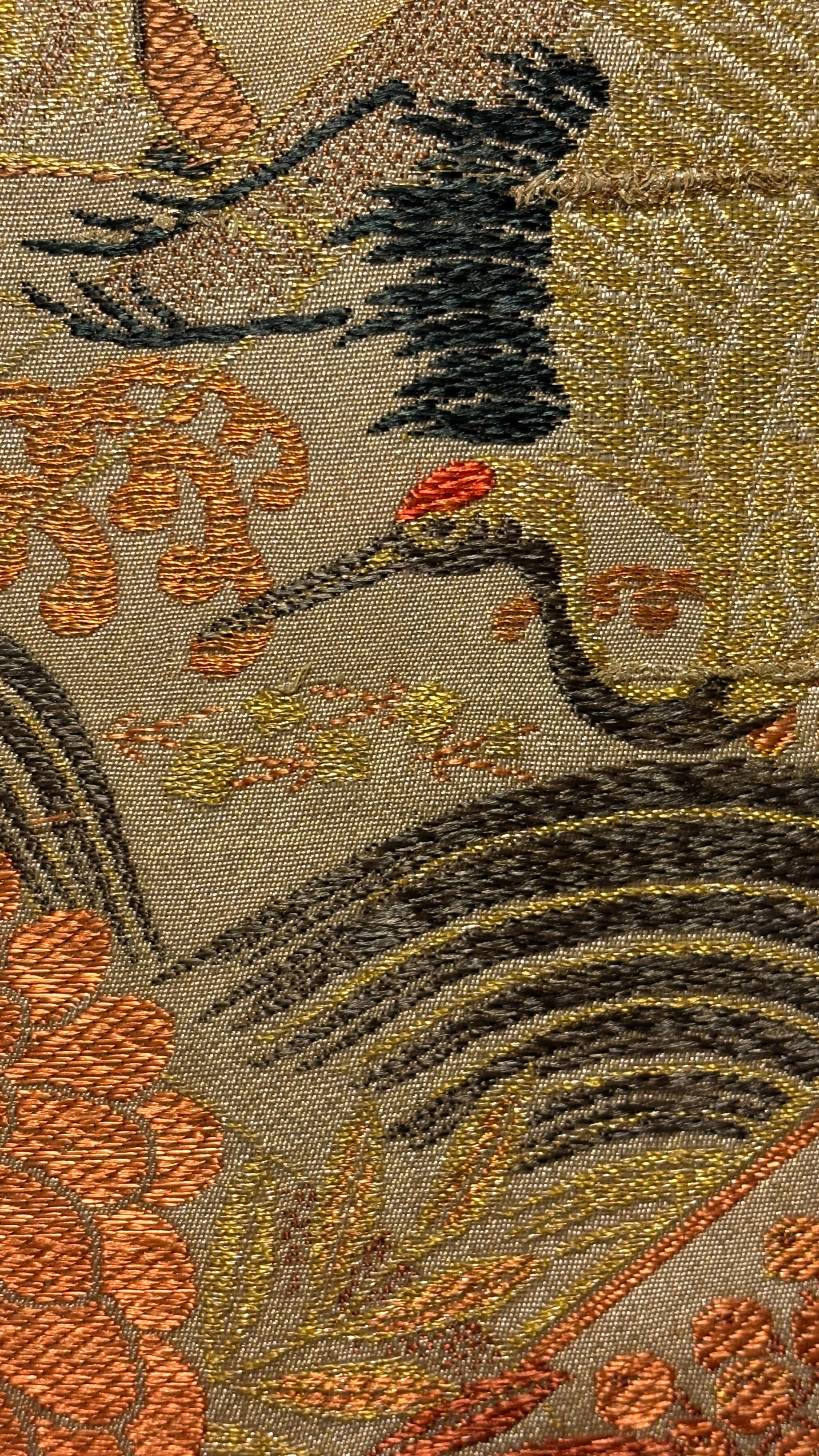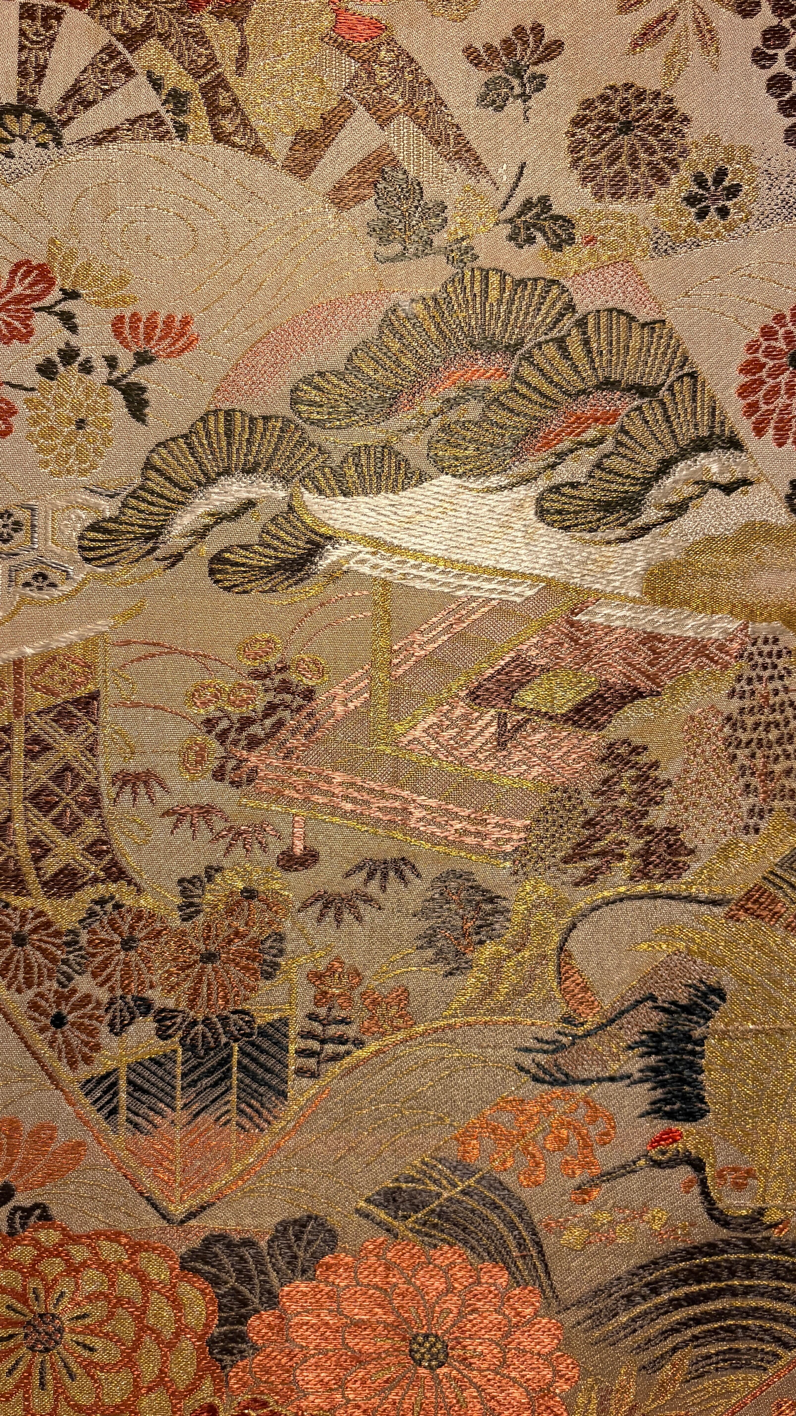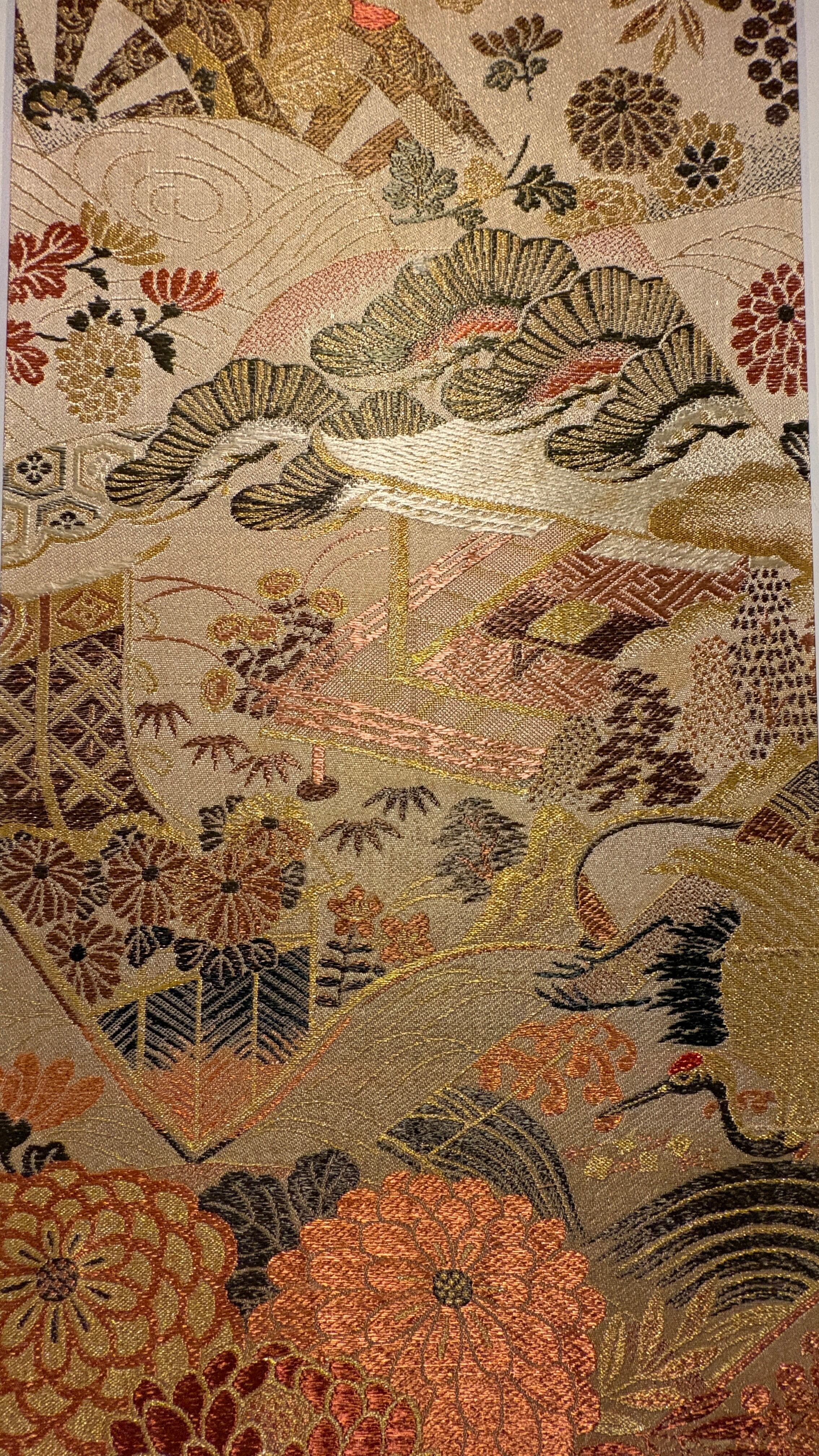 This artwork was created using a vintage obi woven in Nishijin, Kyoto, estimated to date from the 1980s–1990s. Nishijin weaving is renowned for its refined craftsmanship and rich decorative designs.
