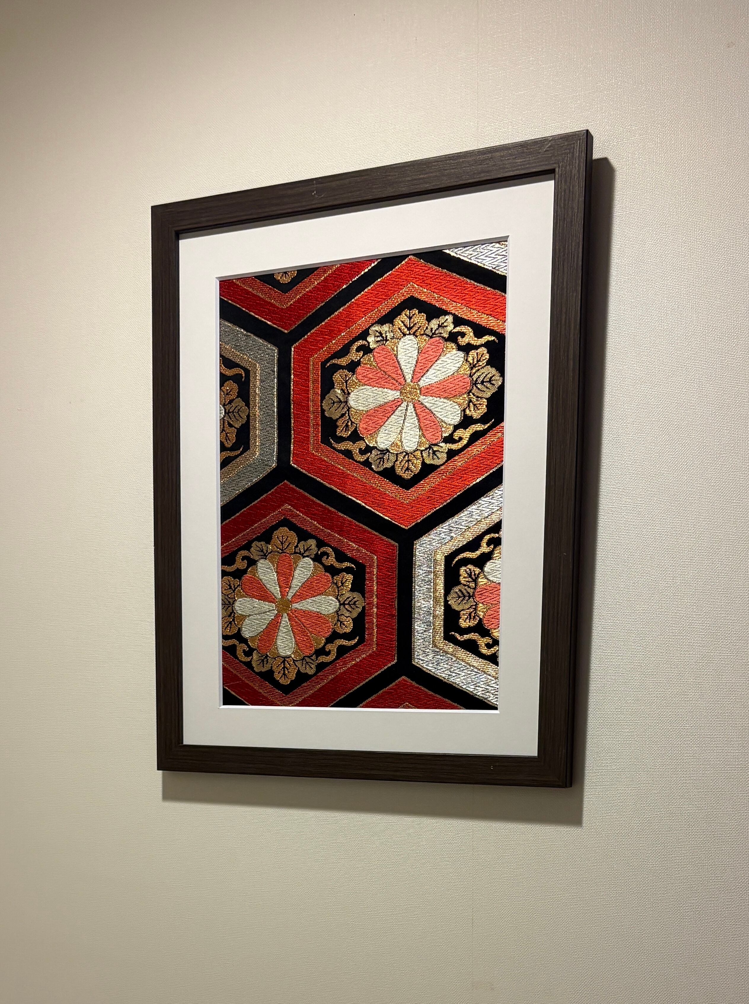 重厚感のある生地と細部にまで織り出された文様、金銀と朱色の力強くも美しい発色。