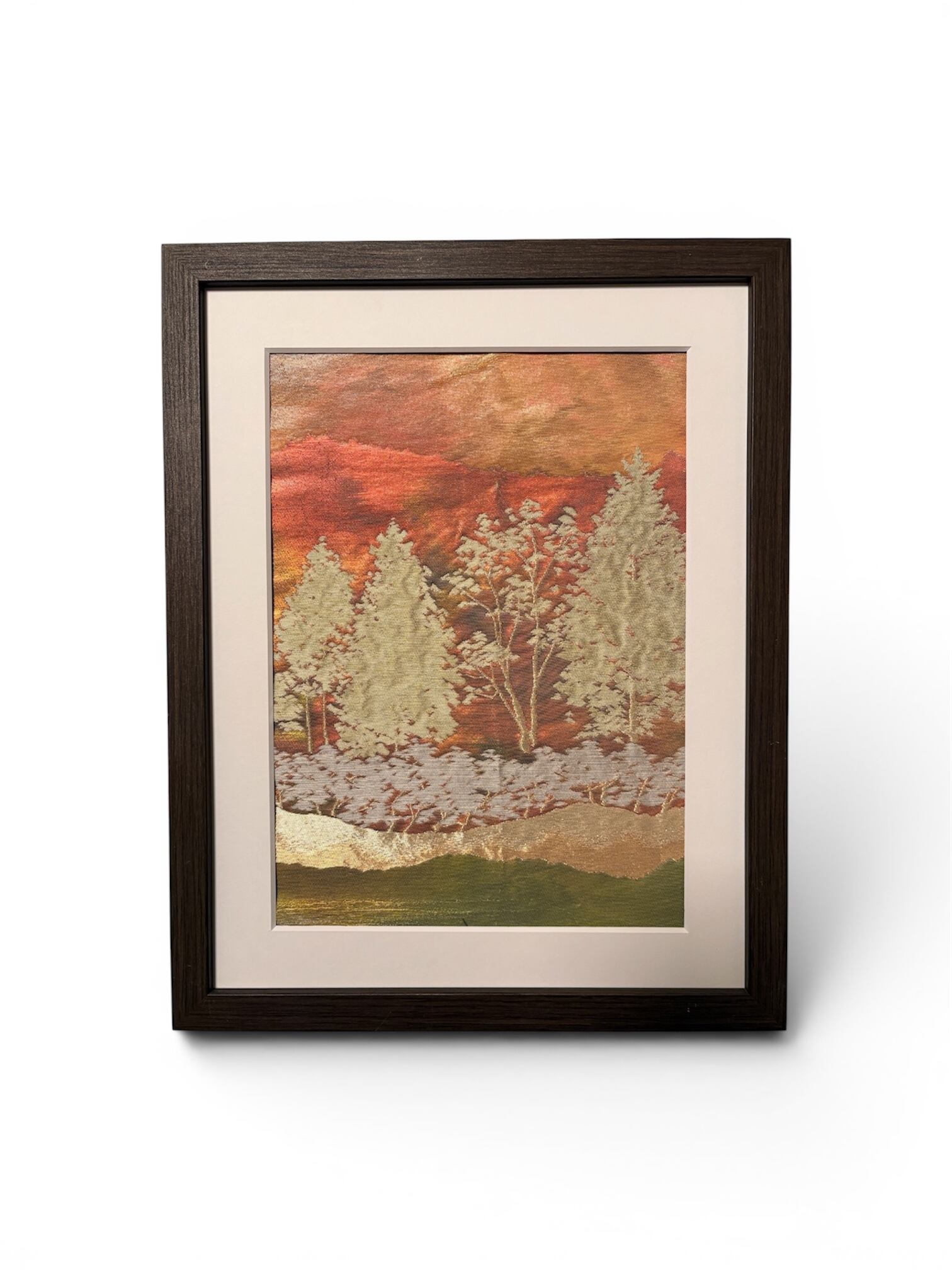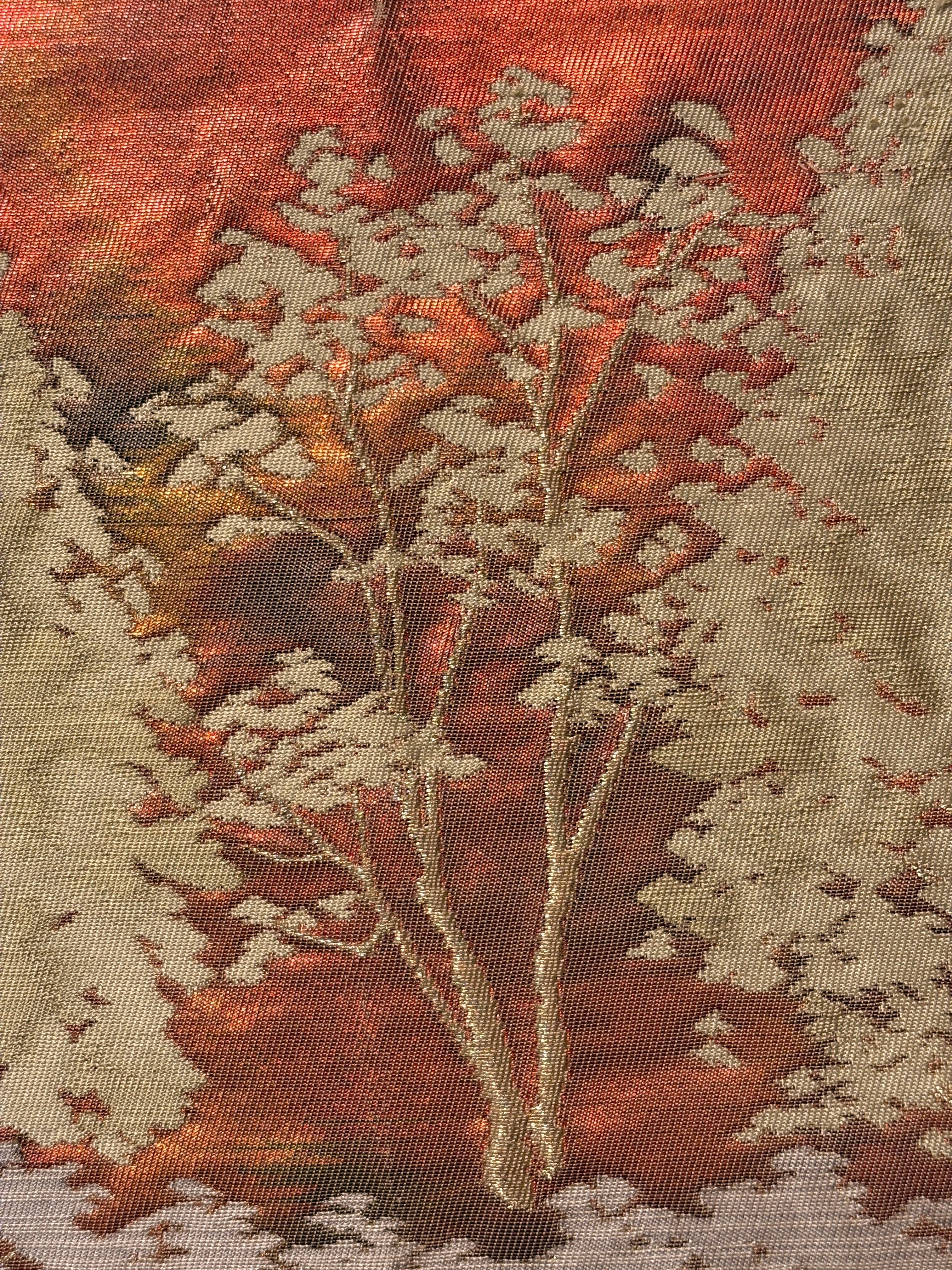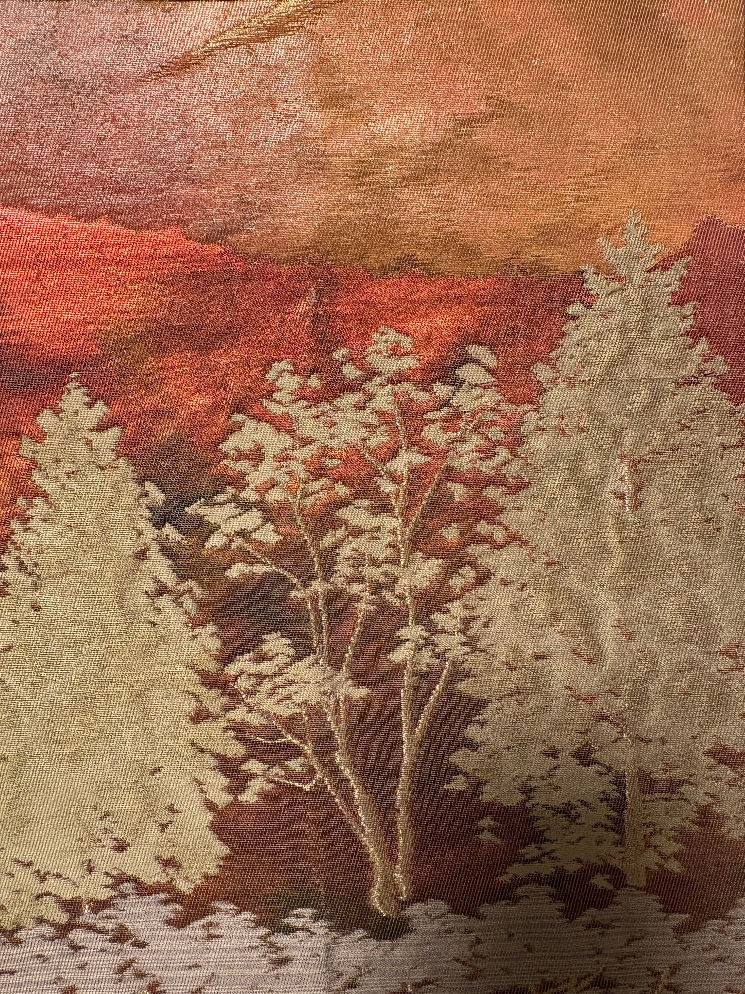 特に樹木の立体感のある表現や多重色グラデーションは、西陣織の高度な技法の証です。
