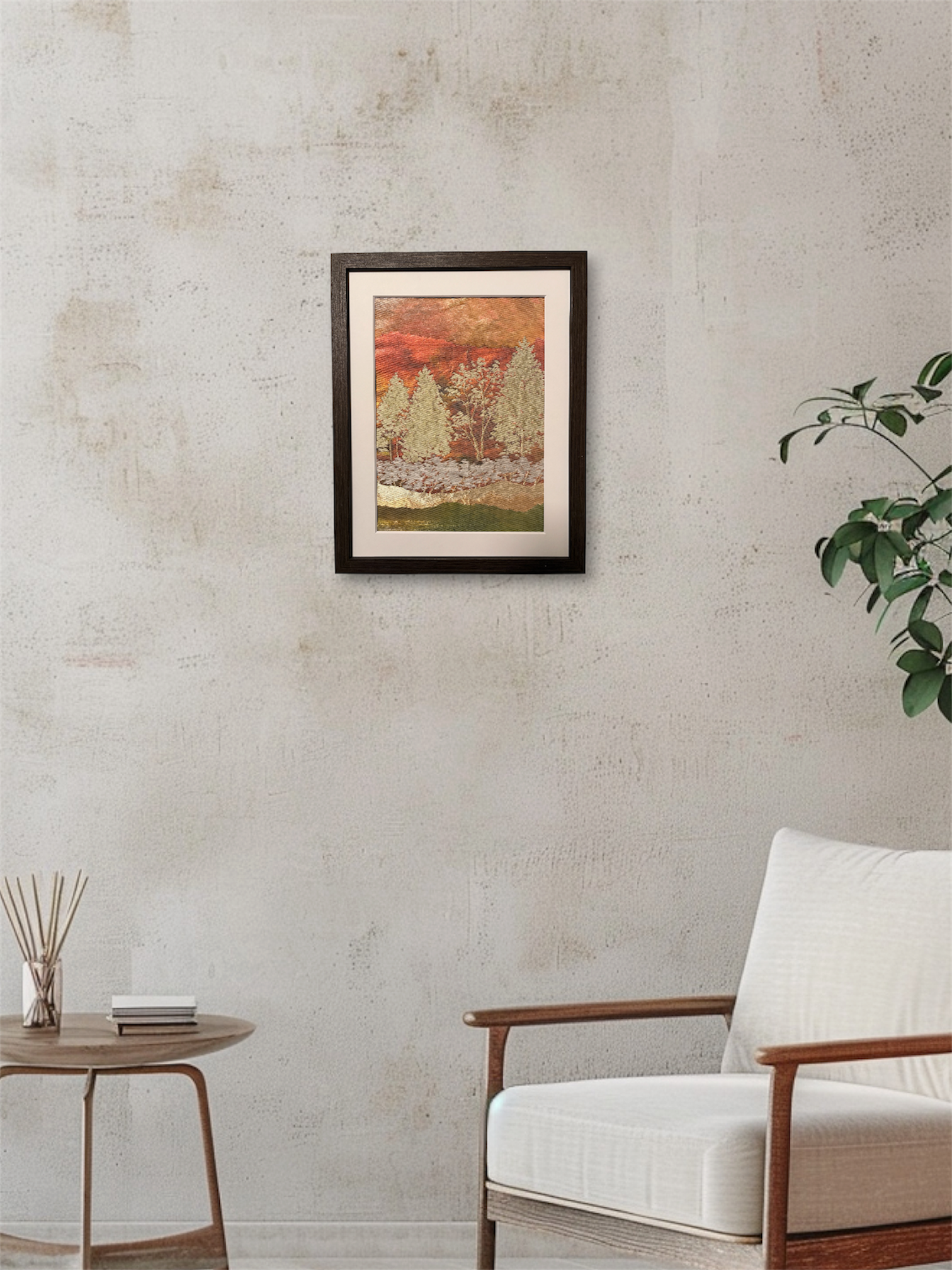 中央には細やかな枝ぶりの木があり、生命の繊細さや季節の移ろいを表現しているかのよう。